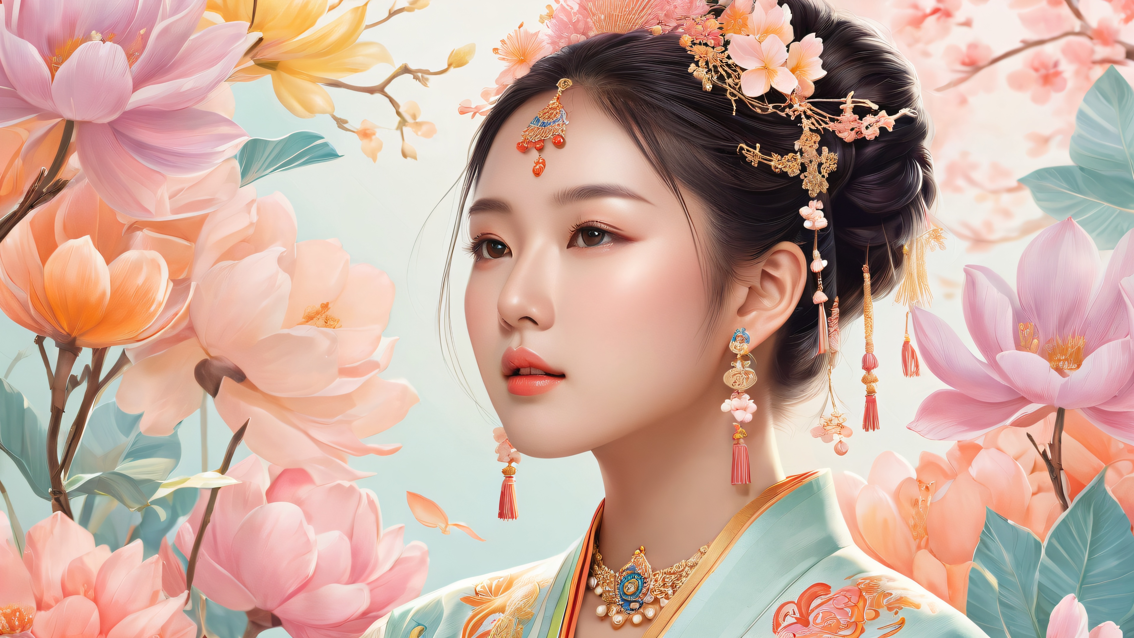 A breathtaking desktop wallpaper of women, perfectly clean vast pure void, extreme depth of field, award-winning digital art, pristine clarity, ETHEREAL LIGHTING: Radiant, brilliant colors, ray traced reflections, und makellose Klarheit. Bright and airy., [‘#FFFFFF’, ‘Asian-inspired color palette (soft pastels with Asian motifs)’], 16:9 aspect ratio, ätherische Beleuchtung, radiant, brilliant colors, ray traced reflections, pristine clarity, award-winning digital art, epic breathtaking scale, stunning visual impact, perfect composition, highly textured surfaces, intricate micro-details, physically based rendering, macOS wallpaper aesthetic, Meisterwerk, highest quality, highly detailed, 8k resolution.