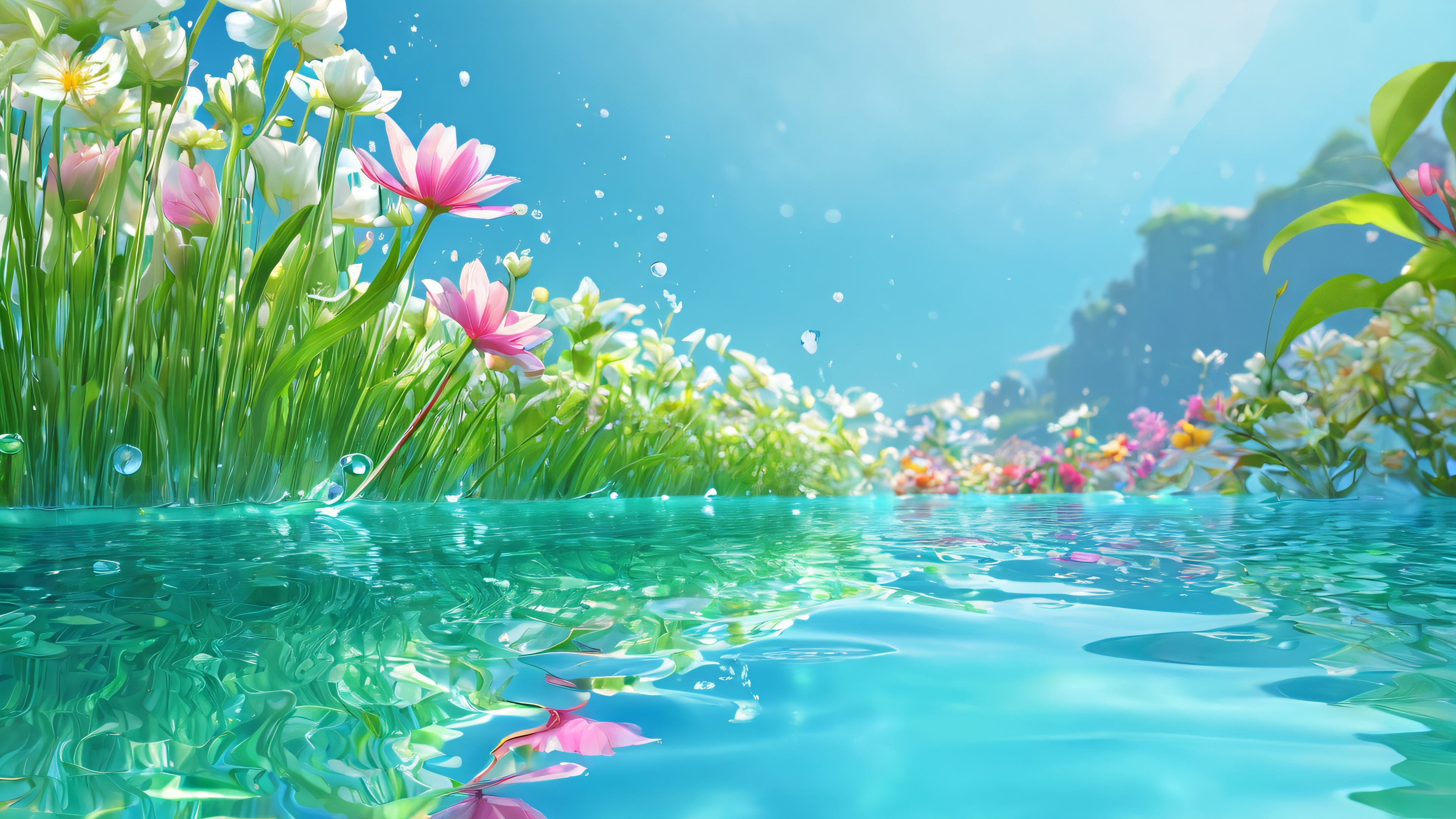A breathtaking desktop wallpaper of Flowers and Water, Perfectly clean vast pure void, extreme depth of field with suspended particles and gentle ripples on the water, Award-winning digital art, pristine clarity, Ethereal lighting with radiant, brilliant colors, ray traced reflections, und makellose Klarheit, bright and airy, [‘Pastel Greens’, ‘Soft Blues’], 16:9 aspect ratio, ätherische Beleuchtung, radiant, brilliant colors, ray traced reflections, pristine clarity, award-winning digital art, epic breathtaking scale, stunning visual impact, perfect composition, highly textured surfaces, intricate micro-details, physically based rendering, macOS wallpaper aesthetic, Meisterwerk, highest quality, highly detailed, 8k resolution.