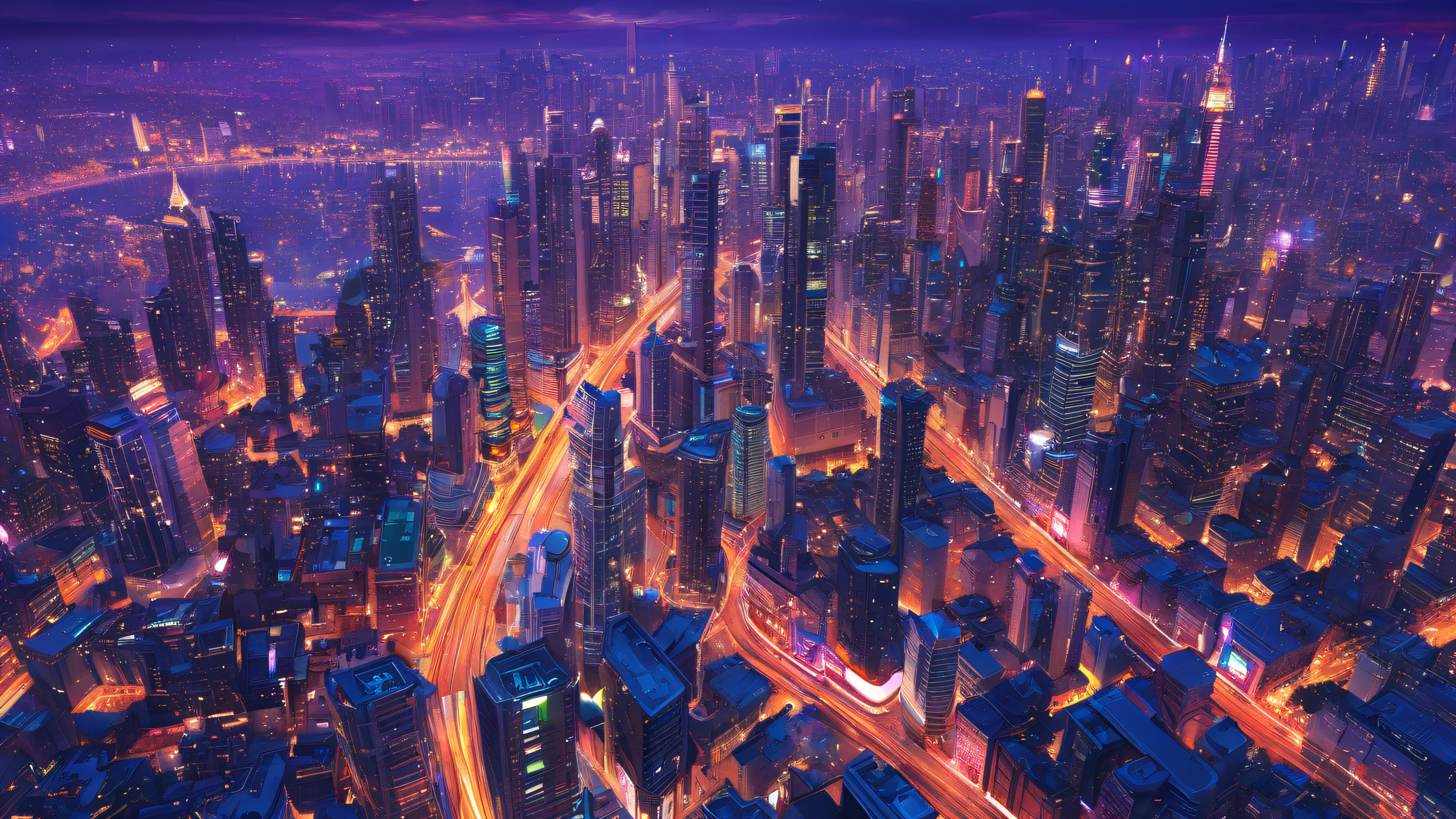 This stunning digital art piece transports you to a futuristic metropolis, where towering skyscrapers and neon lights create an immersive experience. The 16:9 aspect ratio and ray-traced reflections add to the sense of scale and realism, while the ethereal lighting and brilliant colors evoke a sense of wonder.