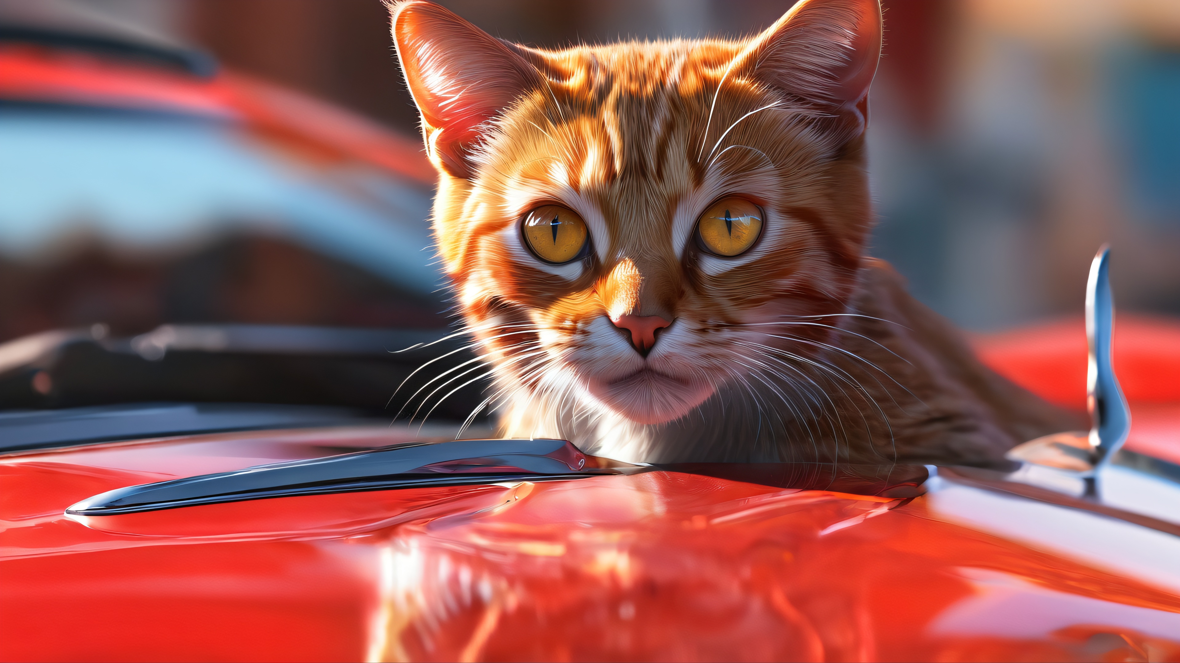 A breathtaking desktop wallpaper of Feline Hero, perfectly clean vast pure void, extreme depth of field, Mad Maxx world on the hood of a car, award-winning digital art, pristine clarity, ETHEREAL LIGHTING. Radiant, brilliant colors, ray traced reflections, und makellose Klarheit. Bright and airy., [‘Red’, ‘Black’, ‘Chrome’], 16:9 aspect ratio, ätherische Beleuchtung, radiant, brilliant colors, ray traced reflections, pristine clarity, award-winning digital art, epic breathtaking scale, stunning visual impact, perfect composition, highly textured surfaces, intricate micro-details, physically based rendering, macOS wallpaper aesthetic, Meisterwerk, highest quality, highly detailed, 8k resolution.