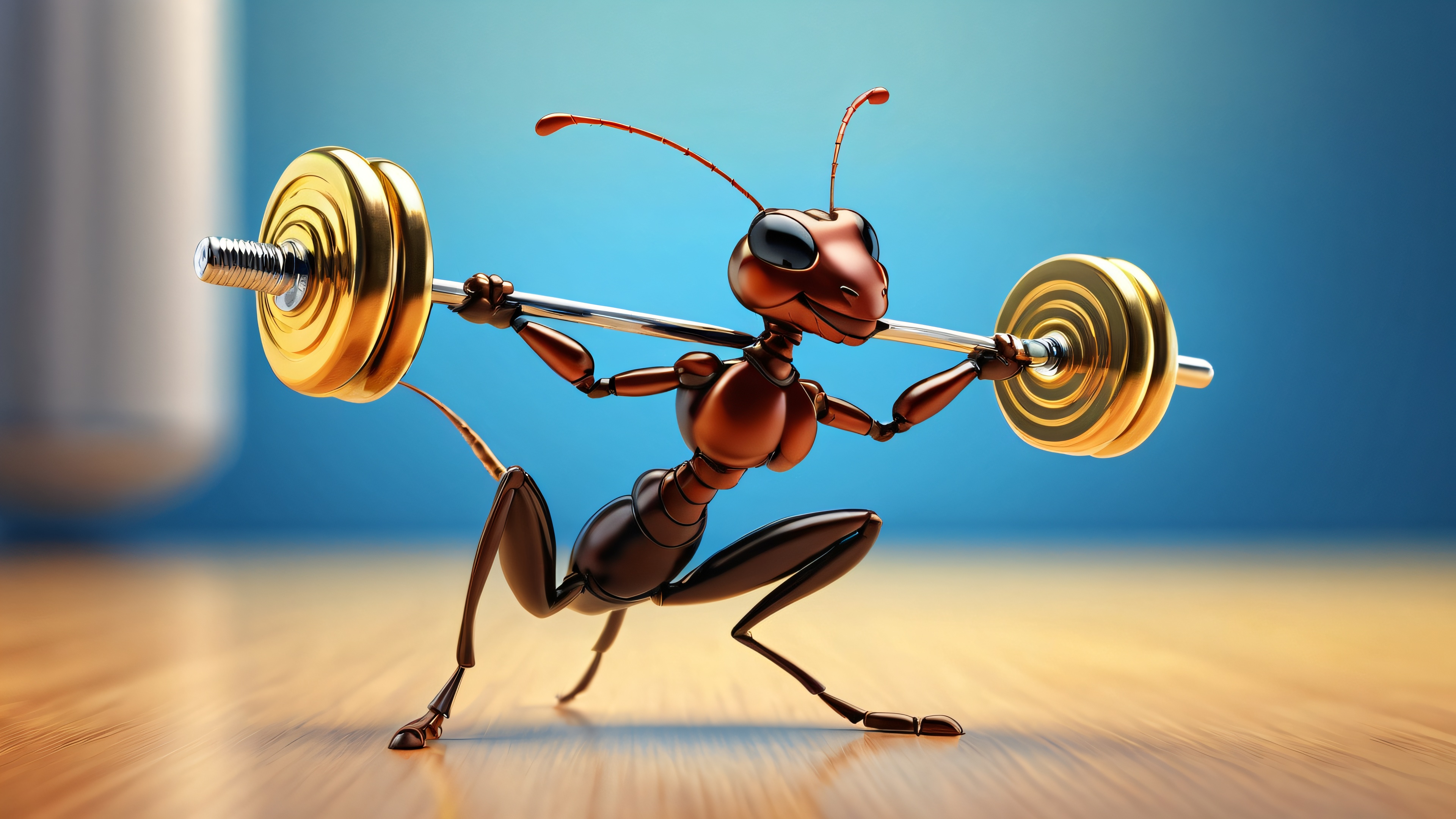 A breathtaking desktop wallpaper of Ant Lifting Dumbbell, perfectly clean vast pure void, extreme depth of field, miniature gym setting, award-winning digital art, pristine clarity, photorealistic rendering, Ethereal Lighting: Strahlend, brilliant colors, ray traced reflections, und makellose Klarheit. Bright and airy., [‘Deep Blue’, ‘Bright Gold’, ‘Rich Brown’], 16:9 aspect ratio, ätherische Beleuchtung, radiant, brilliant colors, ray traced reflections, pristine clarity, award-winning digital art, epic breathtaking scale, stunning visual impact, perfect composition, highly textured surfaces, intricate micro-details, physically based rendering, macOS wallpaper aesthetic, Meisterwerk, highest quality, highly detailed, 8k resolution.