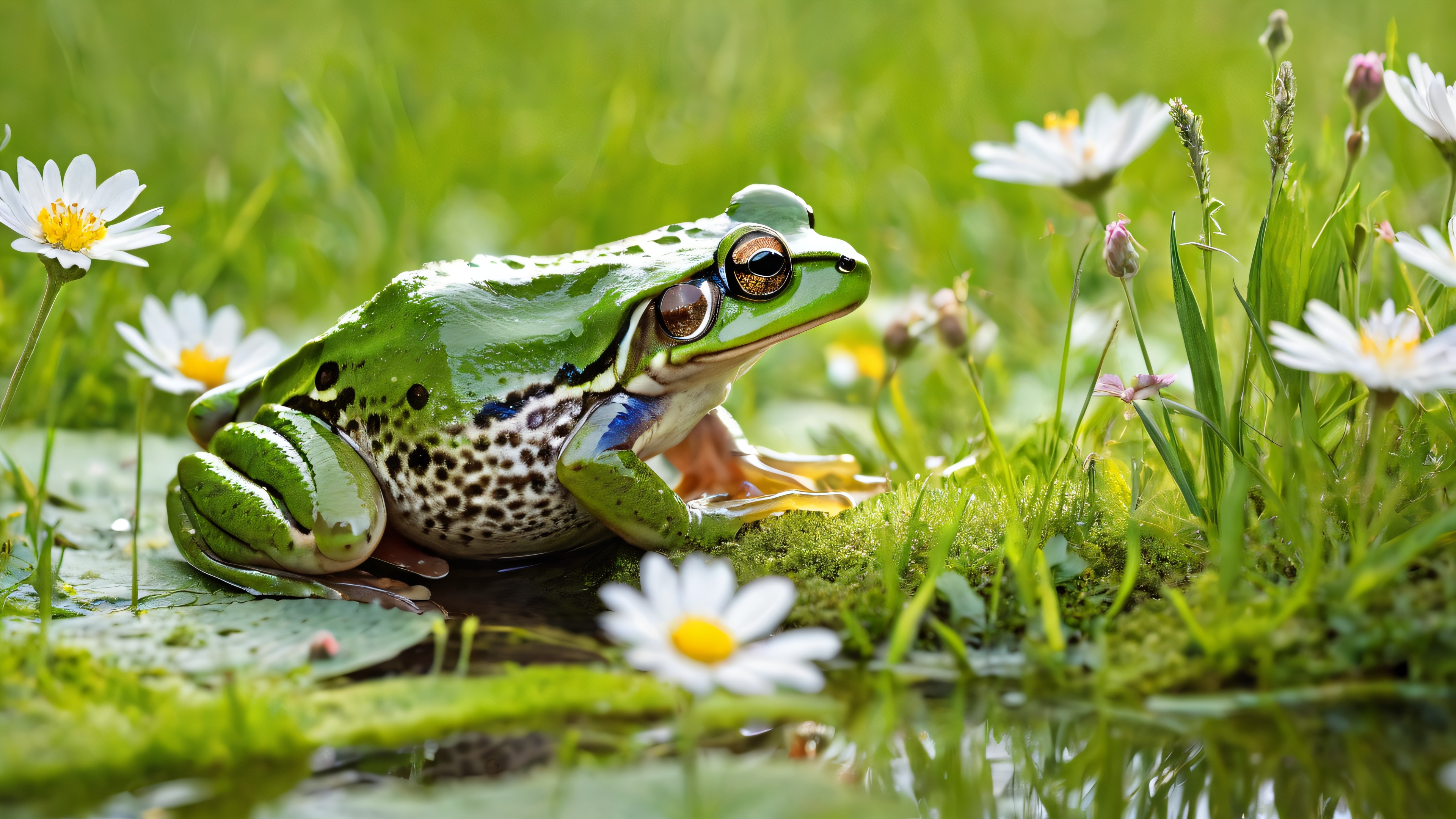 A breathtaking desktop wallpaper of Frog, Perfectly clean vast pure void, extreme depth of field, meadow background with soft wildflowers and green grass, Award-winning digital art, pristine clarity, watercolor illustration, fine brush textures, Ethereal lighting, radiant brilliant colors, ray traced reflections, bright and airy, gentle daylight, #C9E4CA #66B3FF #F7D2C4, 16:9 aspect ratio, ätherische Beleuchtung, radiant, brilliant colors, ray traced reflections, pristine clarity, award-winning digital art, epic breathtaking scale, stunning visual impact, perfect composition, highly textured surfaces, intricate micro-details, physically based rendering, macOS wallpaper aesthetic, Meisterwerk, highest quality, highly detailed, 8k resolution.