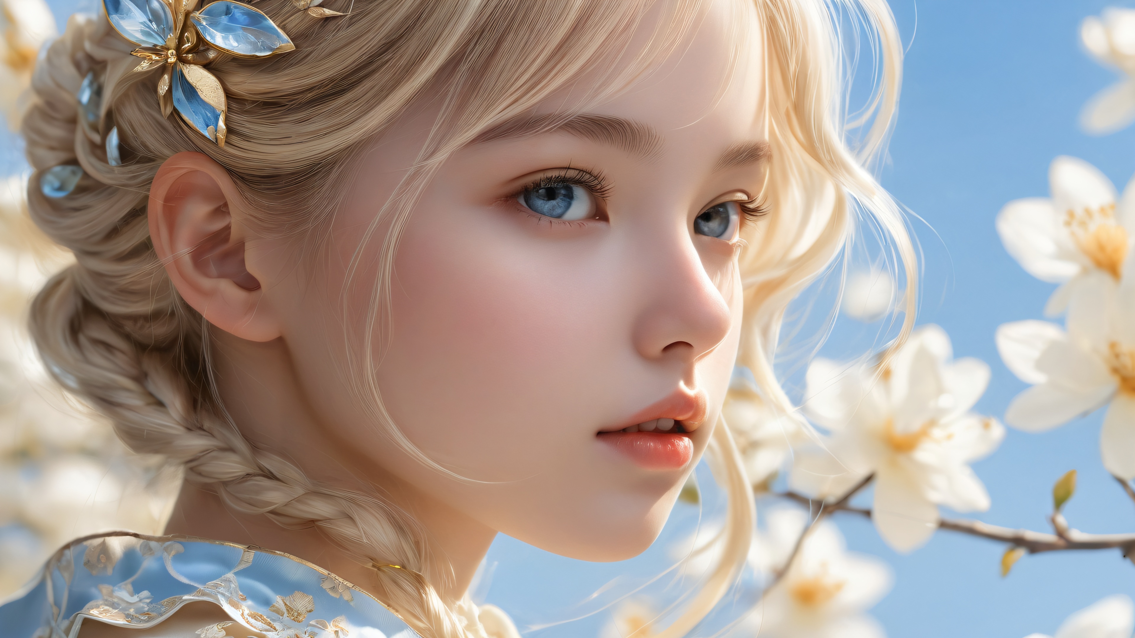 Treten Sie ein in eine ätherische Oase der Ruhe, wo die sanften Blau- und Cremetöne mit blassgoldenen Untertönen verschmelzen. Die extreme Schärfentiefe erzeugt ein Gefühl der Ruhe, as intricate details and realistic rendering come together in perfect harmony. Ethereal lighting radiates brilliant colors, while ray-traced reflections add to the pristine clarity, evoking an airy atmosphere.