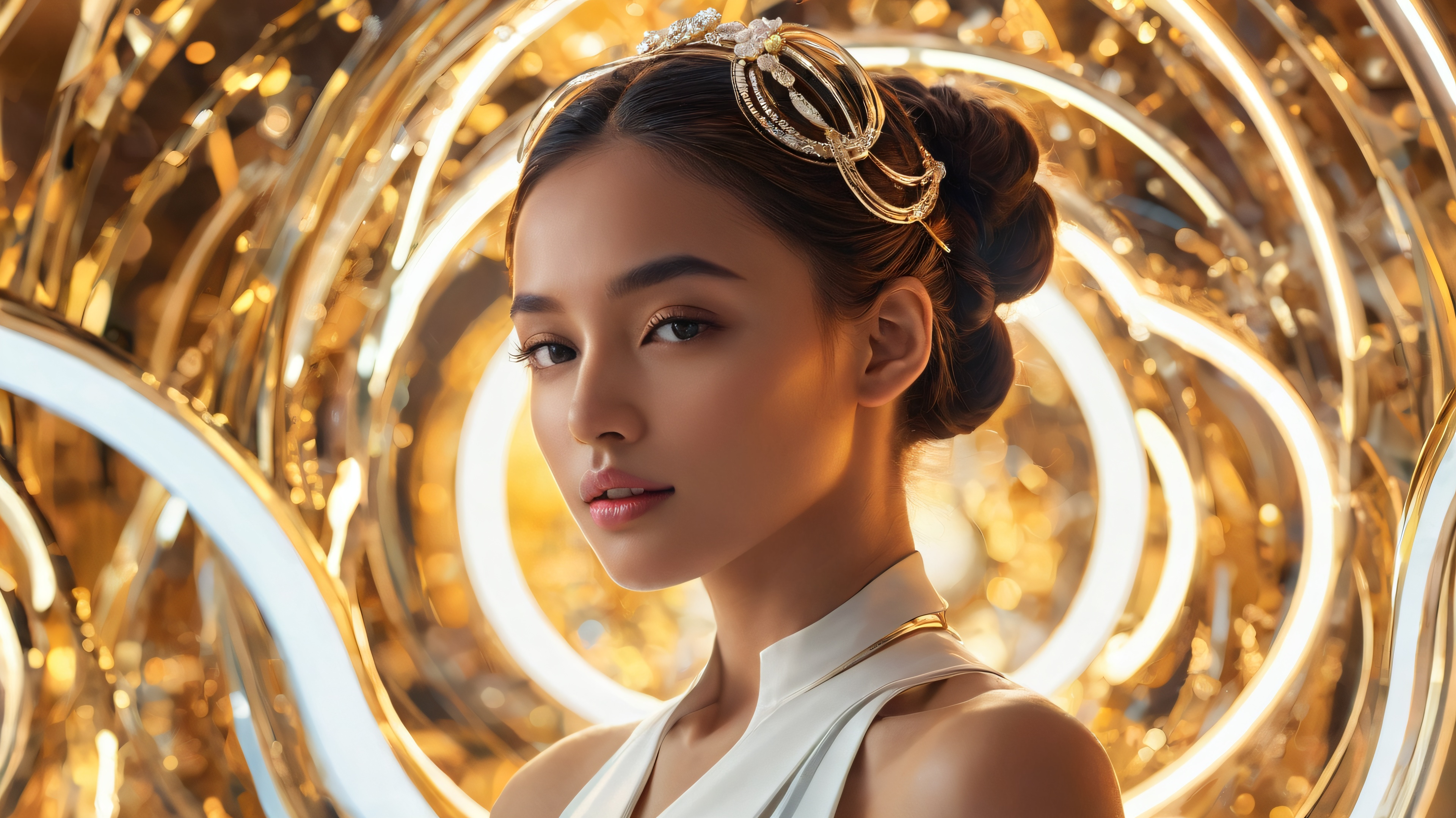 A breathtaking desktop wallpaper of {‘centered_for_horizontal_screens’: True, ‘main_focus’: ‘Prestigious Woman’}, Perfekt gereinigte weite, reine Leere, extreme Schärfentiefe, Award-winning digital art, pristine clarity, Ethereal Lighting: Strahlend, brilliant colors, ray traced reflections, und makellose Klarheit. Bright and airy., [‘Tan’, ‘Gold’, ‘Neon’, ‘Ozonous’], 16:9 Seitenverhältnis, ätherische Beleuchtung, radiant, brilliant colors, ray traced reflections, pristine clarity, award-winning digital art, epic breathtaking scale, stunning visual impact, perfect composition, highly textured surfaces, intricate micro-details, physically based rendering, macOS wallpaper aesthetic, Meisterwerk, highest quality, sehr detailliert, 8k resolution.