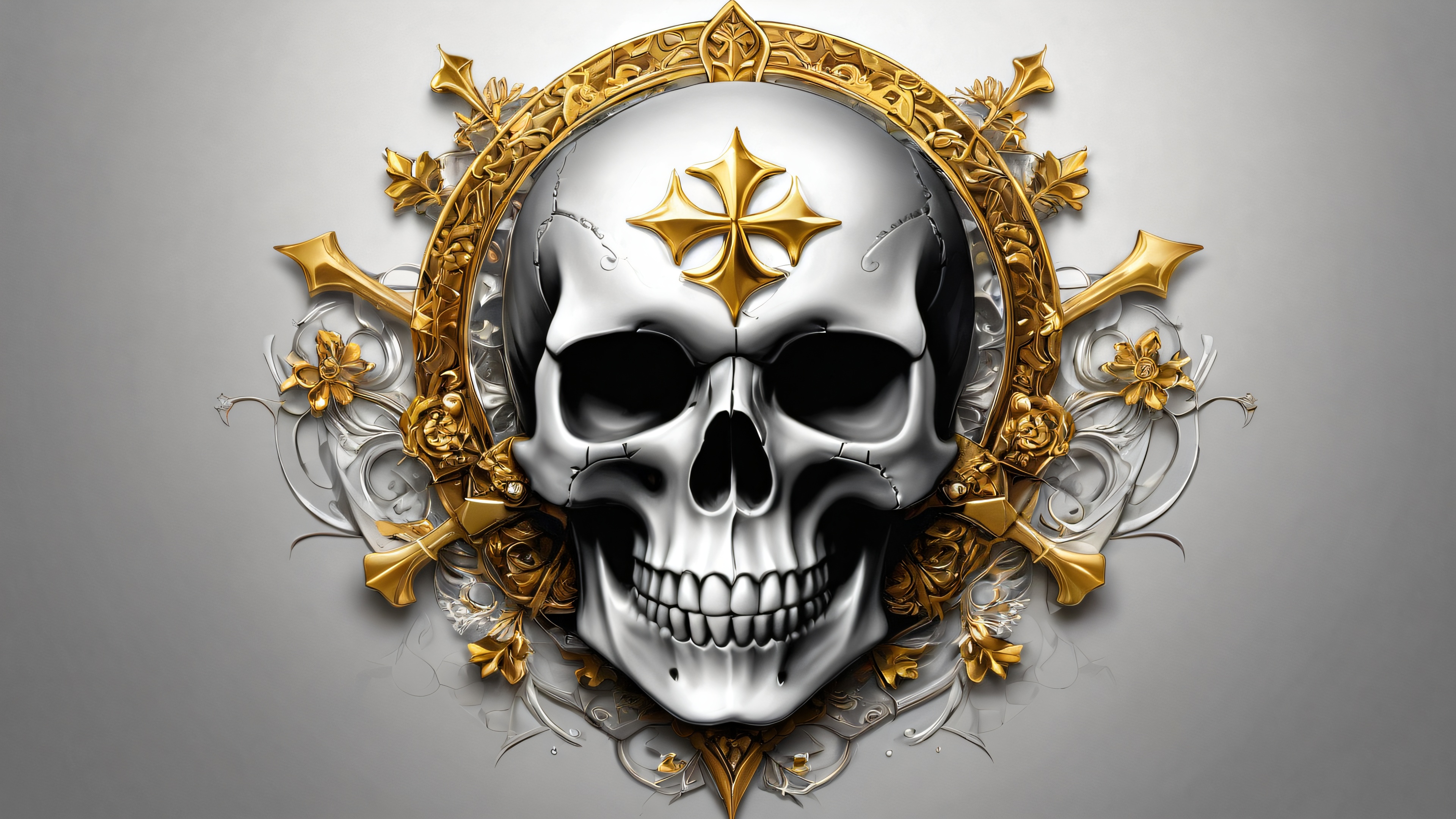 A breathtaking desktop wallpaper of Skull with Symbols and Band Logo, Perfectly clean vast pure void, extreme depth of field, Award-winning digital art, pristine clarity, Ethereal lighting, radiant brilliant colors, Raytracing-Reflexionen, bright and airy, [‘Dark Grayscale’, ‘Metallic Silvers’, ‘Golden Hues’], 16:9 aspect ratio, ätherische Beleuchtung, radiant, brilliant colors, ray traced reflections, pristine clarity, award-winning digital art, epic breathtaking scale, stunning visual impact, perfect composition, highly textured surfaces, intricate micro-details, physically based rendering, macOS wallpaper aesthetic, Meisterwerk, highest quality, highly detailed, 8k resolution.