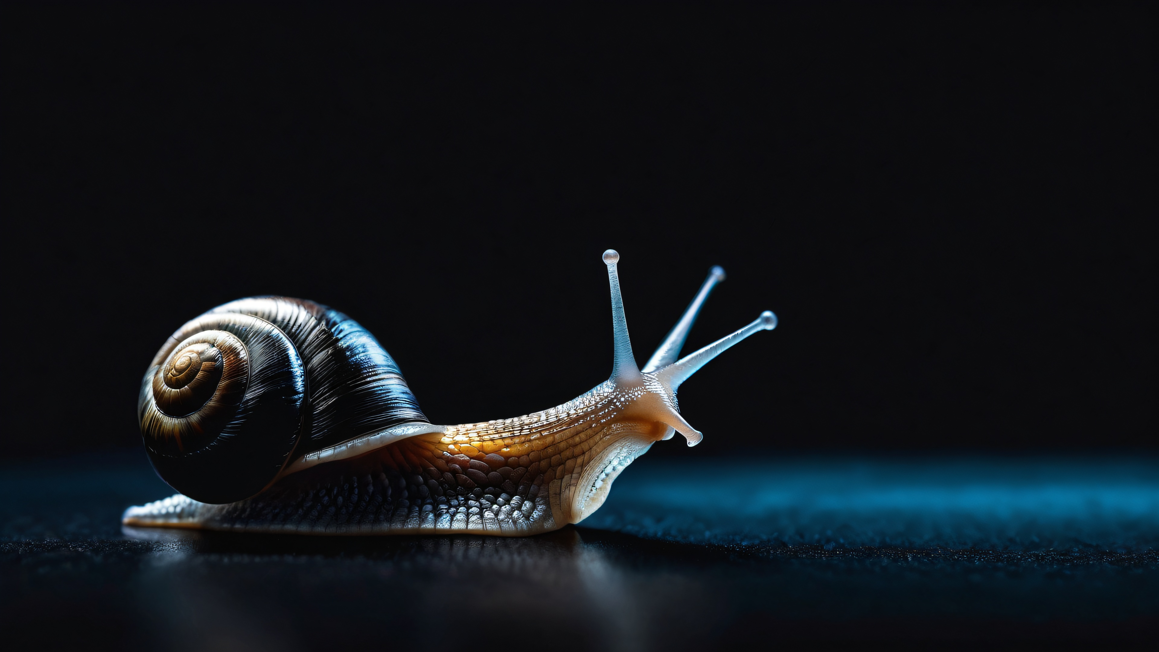 A breathtaking desktop wallpaper of snail, perfectly clean vast pure void, extreme depth of field, award-winning digital art, pristine clarity, SLEEK DARK MODE AESTHETIC. Deep perfect blacks, striking crisp contrast, and elegant luminescent accents., [‘soft pastels’, ‘whispered blues’], 16:9 aspect ratio, elegant low-key lighting, deep perfect blacks, striking contrast, sleek dark mode aesthetic, luminescent accents, deep rich colors, award-winning digital art, epic breathtaking scale, stunning visual impact, perfect composition, highly textured surfaces, intricate micro-details, physically based rendering, macOS wallpaper aesthetic, Meisterwerk, highest quality, highly detailed, 8k resolution.
