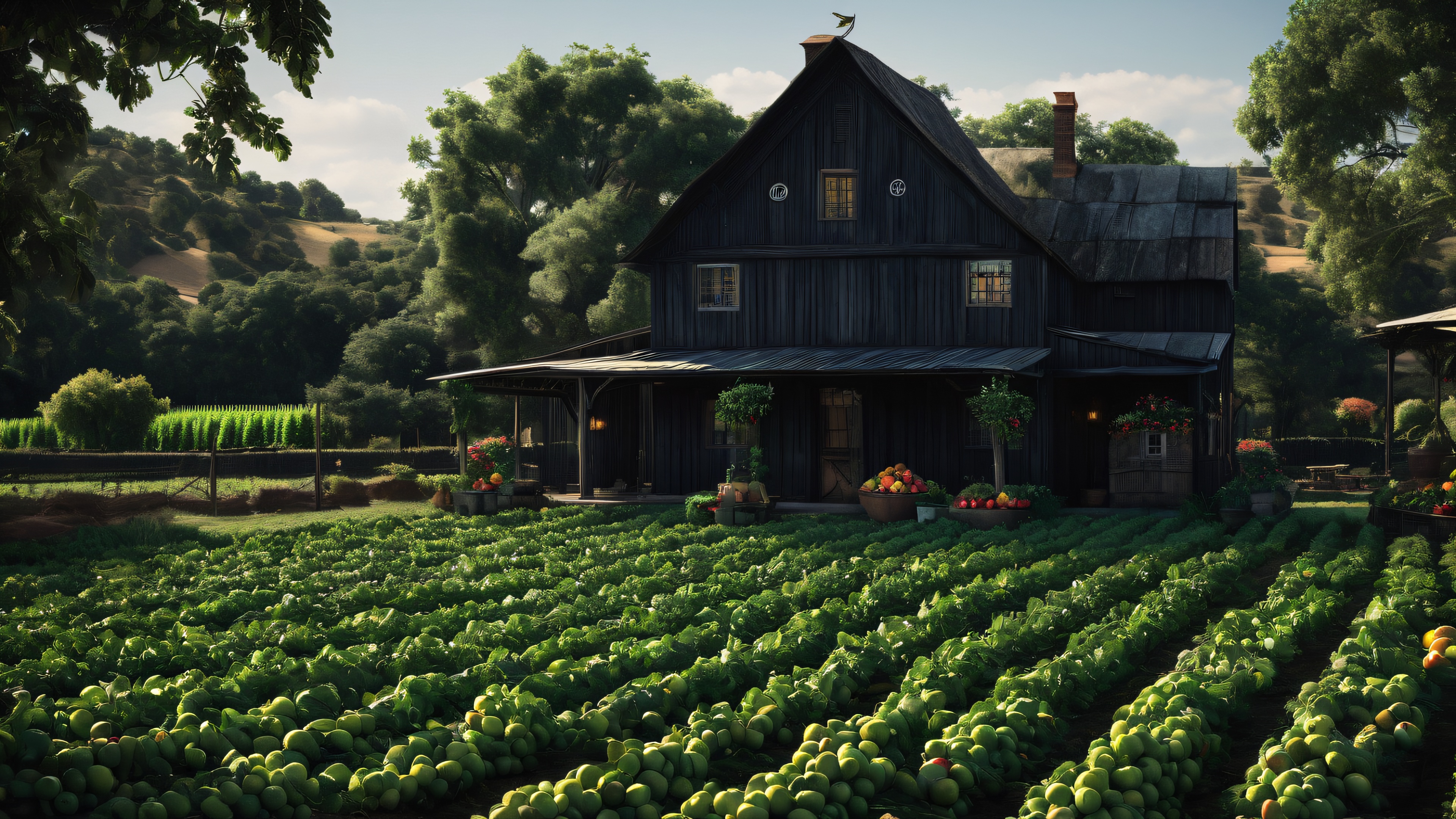 A breathtakingly detailed digital art masterpiece, this wallpaper transports you to a serene fruit farm setting. The rustic farmhouse serves as the perfect backdrop for lush greenery and vibrant fruits, bathed in elegant low-key lighting. Perfect composition, highly textured surfaces, and intricate micro-details come together to create an epic breathtaking scale that will leave your jaw dropped.