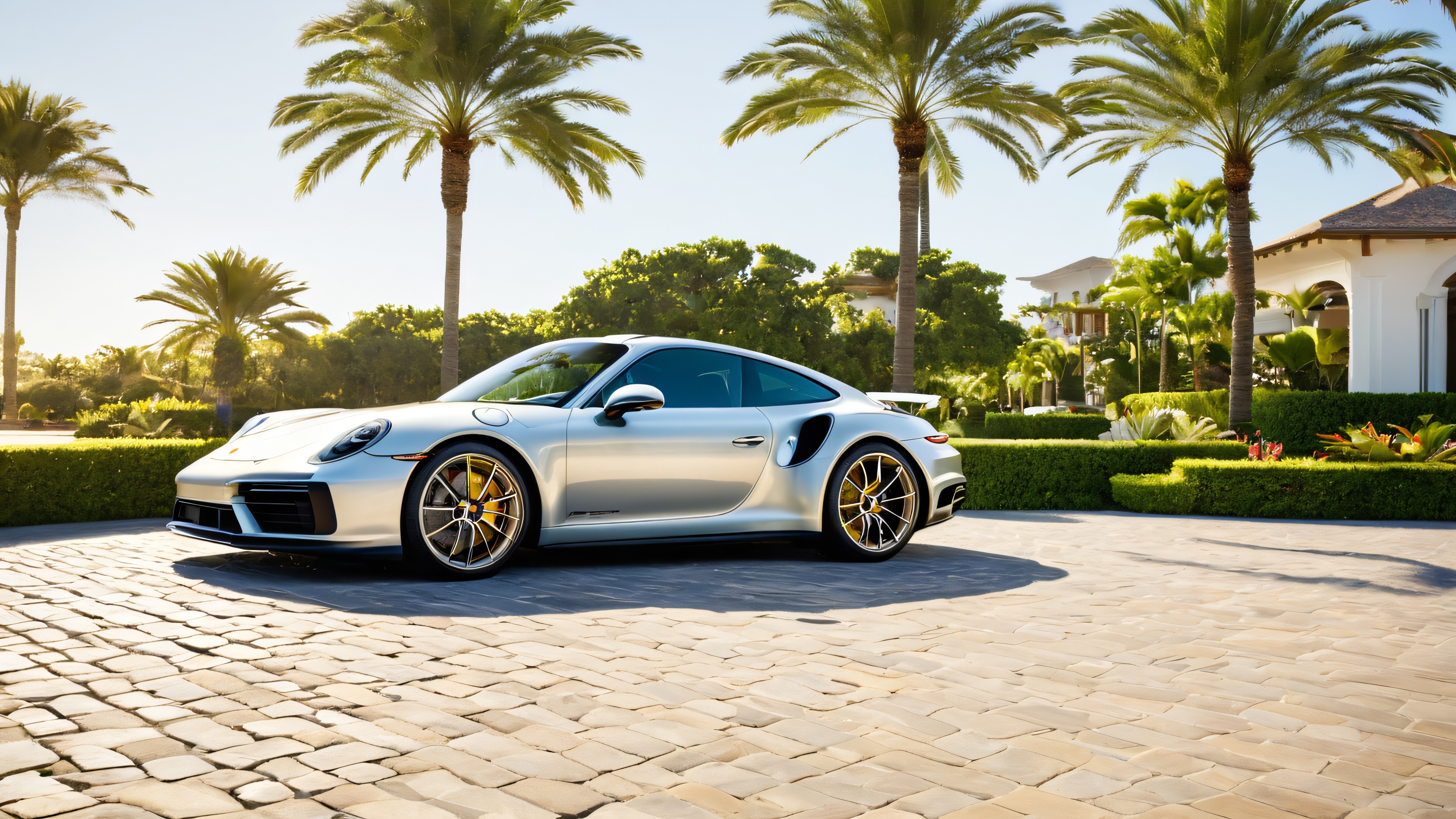 This breathtaking 4K wallpaper captures a serene and sophisticated coastal luxury resort scene. The Porsche 911 Turbo S gleams in warm sunlight, its polished spoiler and wheels reflecting the lush greenery of palm trees. Manicured lawns, pristine white buildings, and towering palm trees create a tranquil atmosphere with hints of exclusivity.