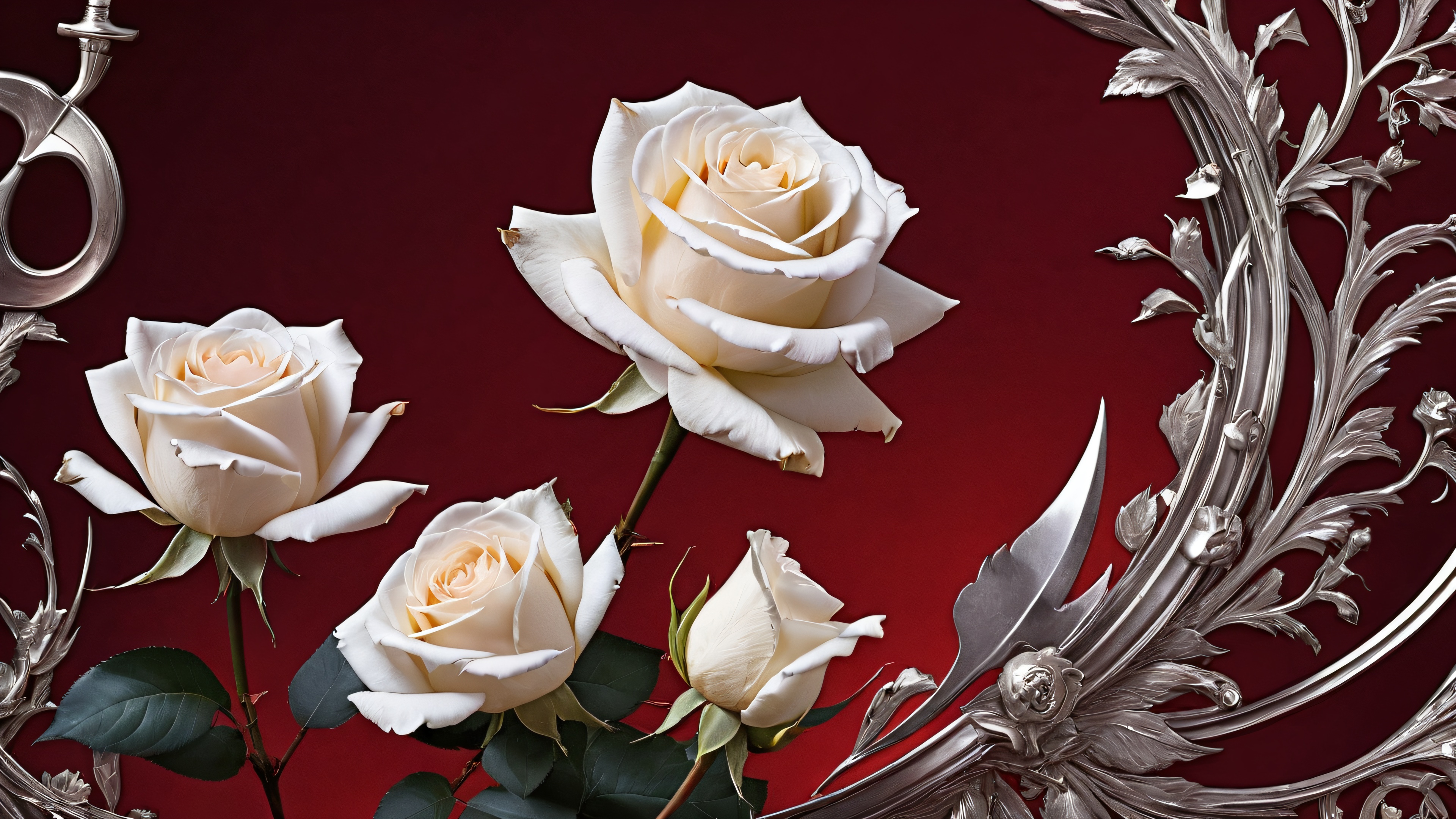 A majestic James Bond-themed wallpaper transports you to an otherworldly realm. The scene unfolds against a deep crimson backdrop, where delicate white roses bloom amidst ancient symbols of the Sickle and Hammer. Ethereal lighting casts a radiant glow, illuminating brilliant colors that seem almost tactile in their texture. Ray-traced reflections dance across metallic surfaces, imbuing the image with an uncanny sense of depth. This stunning masterpiece exudes a bright and airy atmosphere, perfect for your desktop/pc.