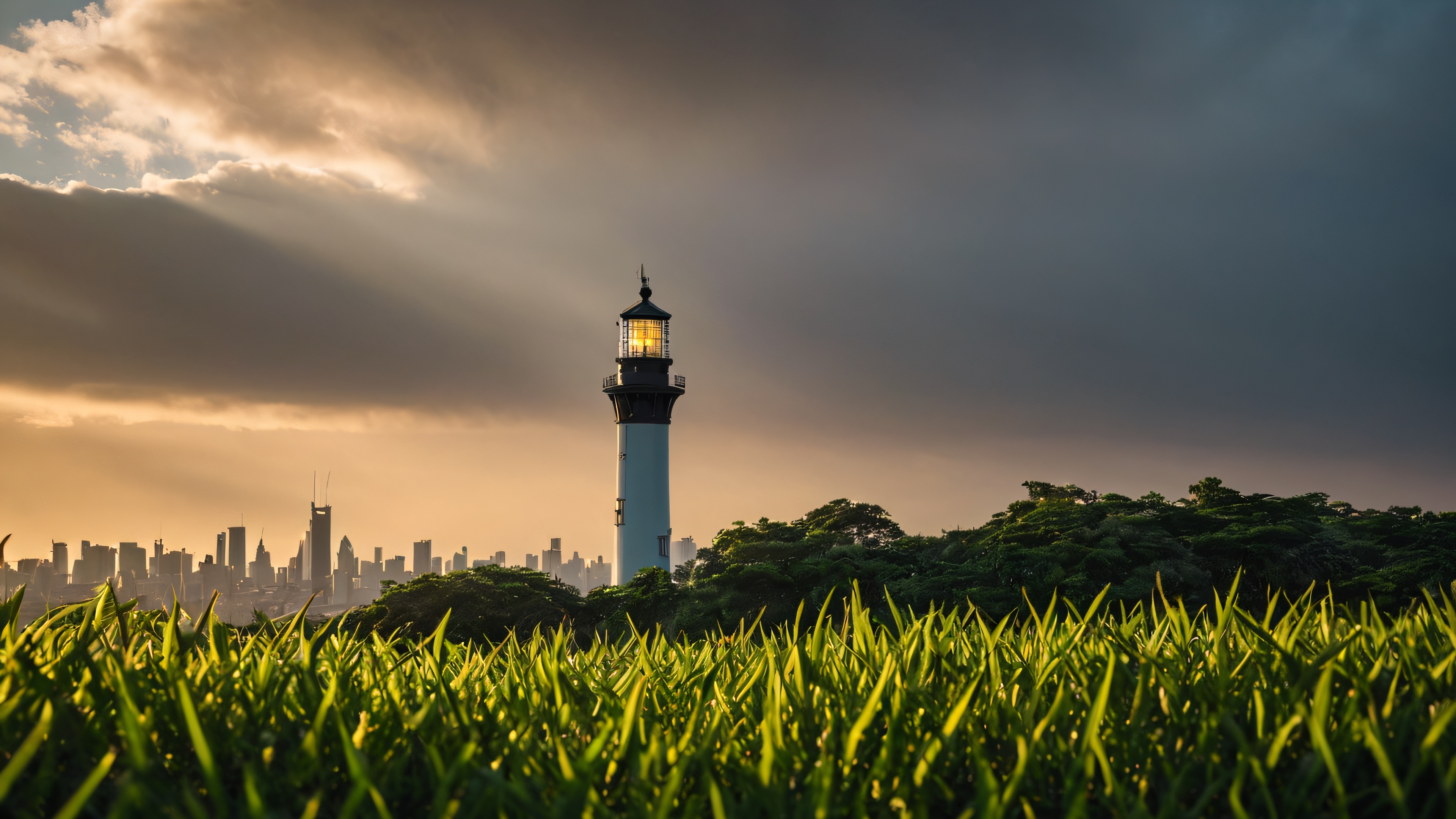 This breathtaking desktop wallpaper features a majestic lighthouse standing out against a minimalist negative space background, with sprawling skysrapes and rooftops fading into the distance. The scene is bathed in warm golden hour lighting, with soft rays peeking through the clouds, casting a gentle glow on the landscape. The predominantly green tone is complemented by hints of blue and beige, evoking a sense of serenity and grandeur.