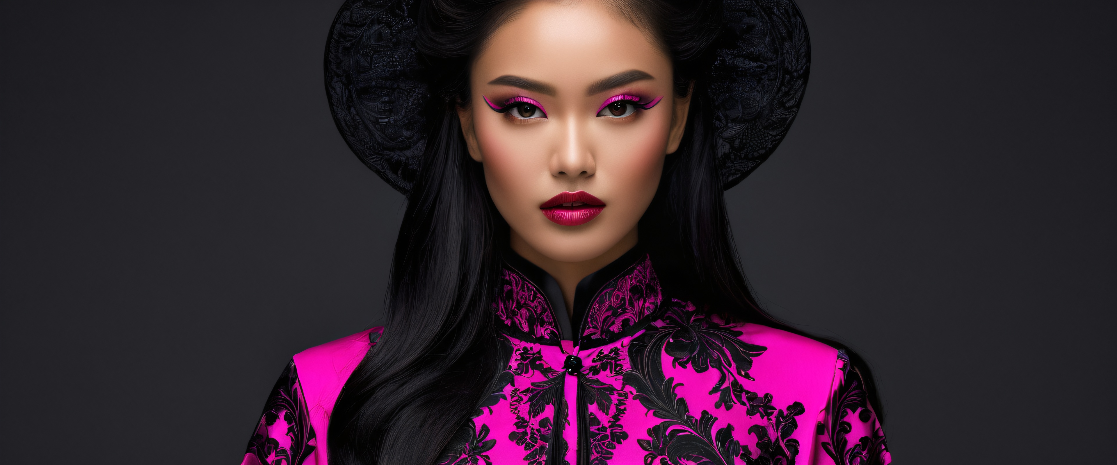 A breathtaking desktop wallpaper of M3GAN (Women), Perfectly clean vast pure void with extreme depth of field for a striking contrast., Award-winning digital art, pristine clarity with intricate details and vivid colors., SLEEK DARK MODE AESTHETIC. Deep perfect blacks, striking crisp contrast, and elegant luminescent accents., [‘Pink’, ‘#FF69B4’], 21:9 ultrawide panoramic aspect ratio, epic wide shot, elegant low-key lighting, deep perfect blacks, striking contrast, sleek dark mode aesthetic, luminescent accents, deep rich colors, award-winning digital art, epic breathtaking scale, stunning visual impact, perfect composition, highly textured surfaces, intricate micro-details, physically based rendering, macOS wallpaper aesthetic, Meisterwerk, highest quality, highly detailed, 8k resolution.