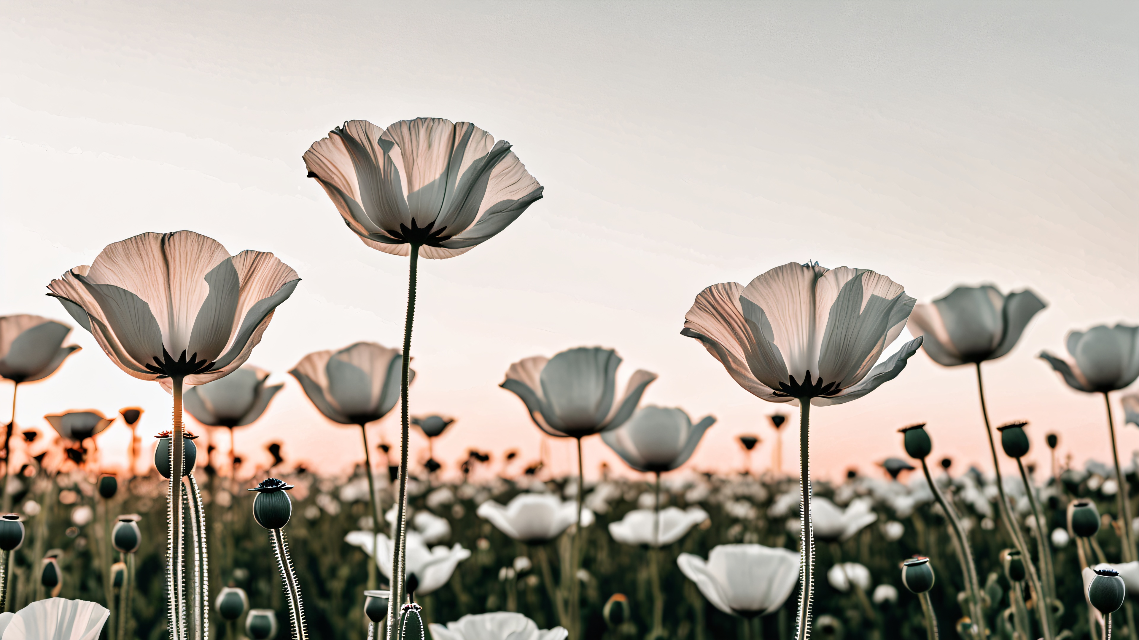 This stunning 4K wallpaper features a highly detailed and muted poppy flower in shades of gray, white, and subtle pastel tones. The simplicity and elegance of the composition create a sense of serenity, inviting viewers to step into the serene atmosphere.