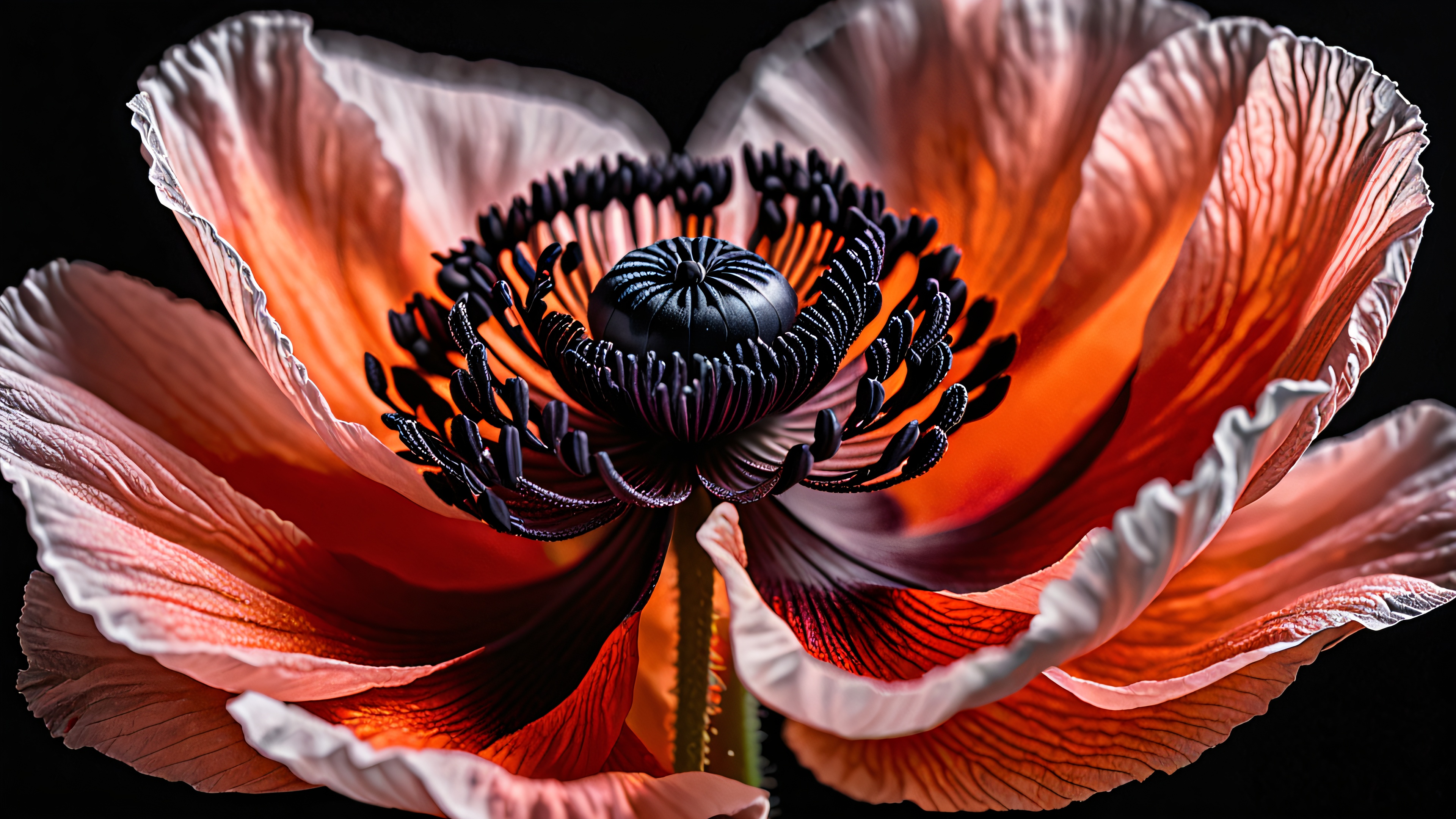 The scene features a minimalist composition of perfectly centered poppy petals, captured in exquisite detail using a macro lens. The delicate texture and intricate details are rendered in stunning monochrome, punctuated by subtle pastel undertones that add softness and whimsy. The OLED pure black background provides dramatic contrast to the creamy bokeh and glowing accents that highlight the petals’ delicate texture.