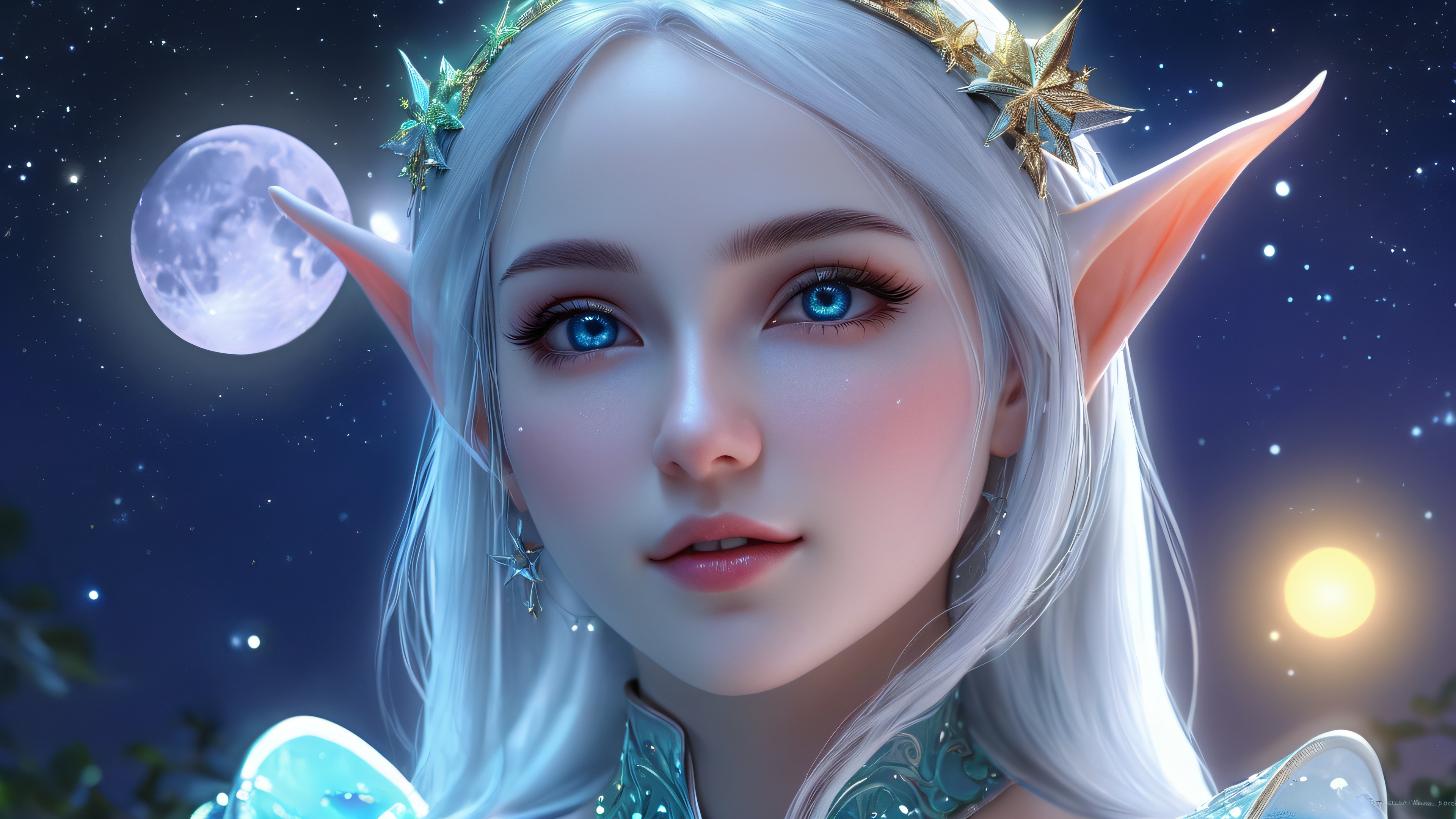 A breathtaking desktop wallpaper of Elf Girl, perfectly clean vast pure void, extreme depth of field with Moon and stars in the night sky, award-winning digital art, pristine clarity, ETHEREAL LIGHTING: Radiant, brilliant colors, ray traced reflections, und makellose Klarheit. Bright and airy., [‘Moonlit blues and silvers’], 16:9 aspect ratio, ätherische Beleuchtung, radiant, brilliant colors, ray traced reflections, pristine clarity, award-winning digital art, epic breathtaking scale, stunning visual impact, perfect composition, highly textured surfaces, intricate micro-details, physically based rendering, macOS wallpaper aesthetic, Meisterwerk, highest quality, highly detailed, 8k resolution.