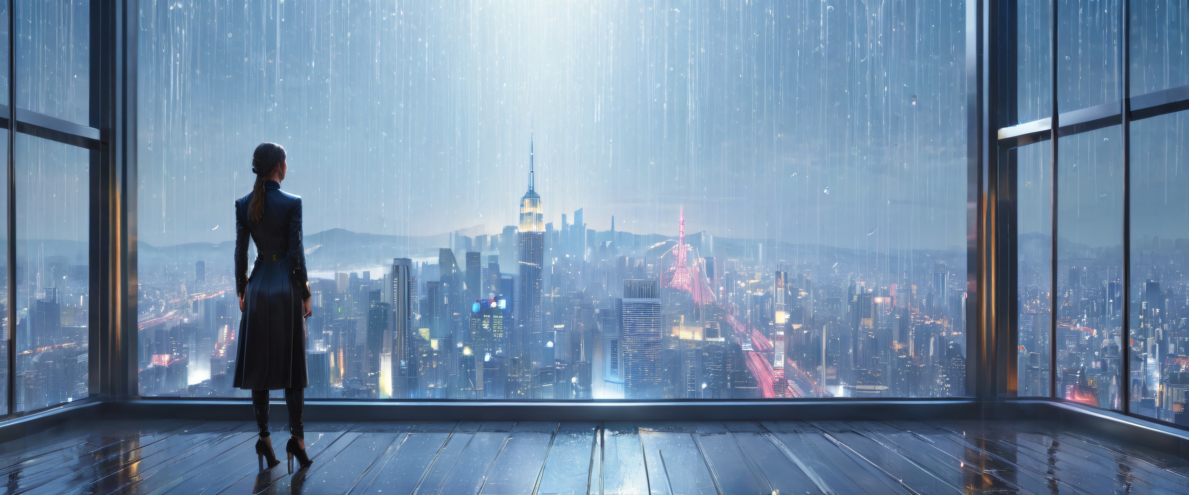 This stunning urban oasis features a mesmerizing cityscape at night, with towering skyscrapers, bustling streets, and a captivating atmosphere that draws the viewer in. The vibrant and ethereal lighting illuminates the scene, with god rays casting a mystical glow over the raindrops on the windowpane, while the city lights below radiate a warm, inviting luminescence.