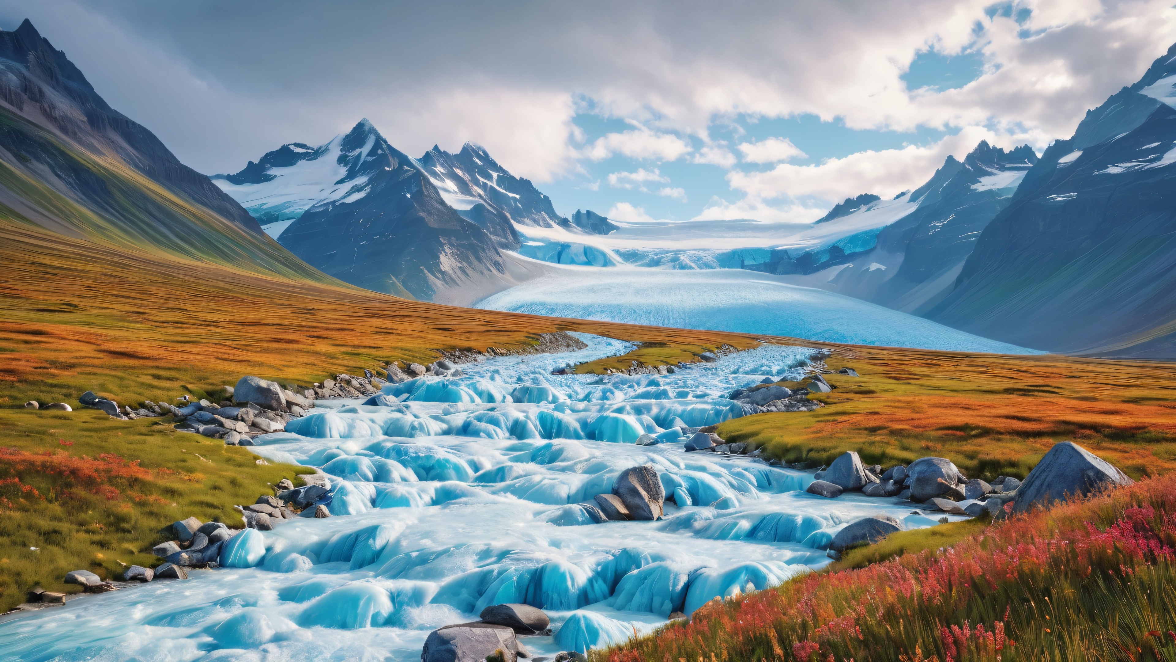 This stunning image showcases the majestic beauty of nature, capturing the atmospheric effects of rain on the rolling prairies. The glacial formations are rendered in exquisite detail, with rich colors that evoke a sense of serenity and wonder. The overall visual aesthetic is breathtakingly realistic, making this 4K wallpaper a masterpiece for desktop backgrounds.