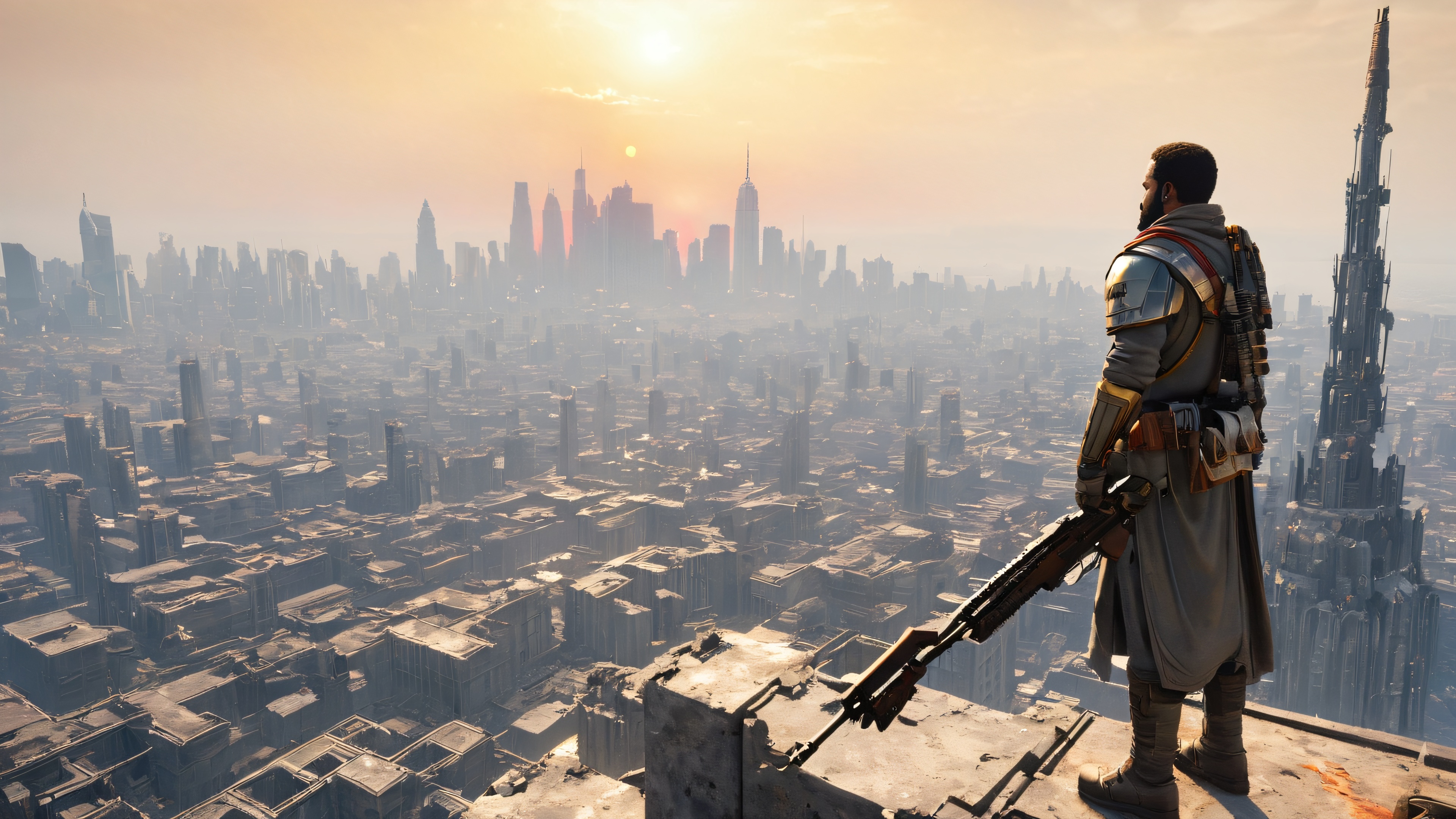 This breathtaking 4K wallpaper features a striking silhouette of a rebel leader standing tall on the remains of a skyscraper, bathed in warm golden light. The muted color palette is punctuated by flashes of crimson and orange, evoking a sense of fiery passion. The distant haze hints at the devastating aftermath of a catastrophe.