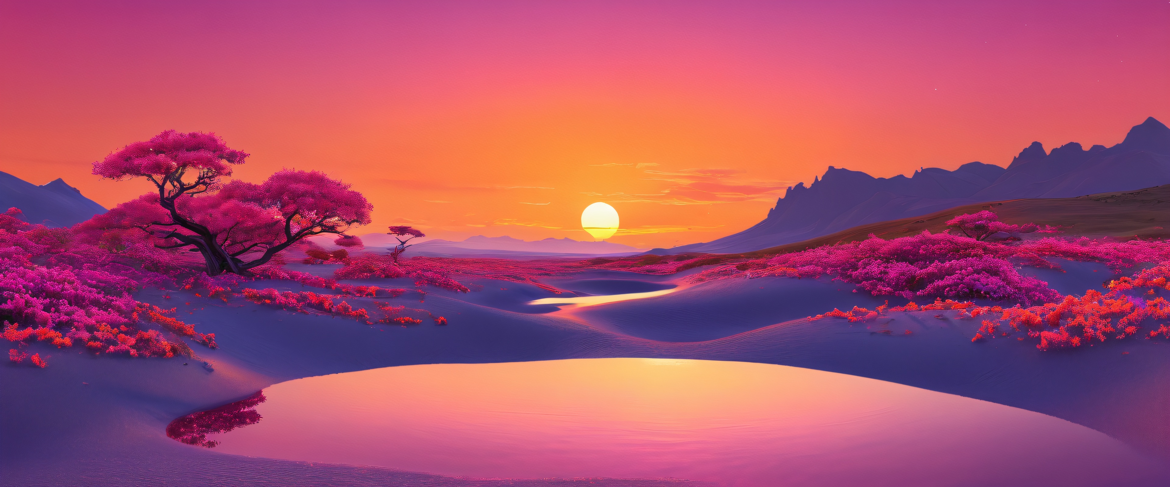 This breathtaking desktop wallpaper captures the essence of a serene sunset landscape. Die Szene ist in Wärme getaucht, radiant colors with an extreme depth of field that creates a sense of depth and dimensionality. The ethereal lighting casts a golden glow on the distant horizon, while the ray-traced reflections add a touch of physical realism to the highly detailed, textured surfaces.
