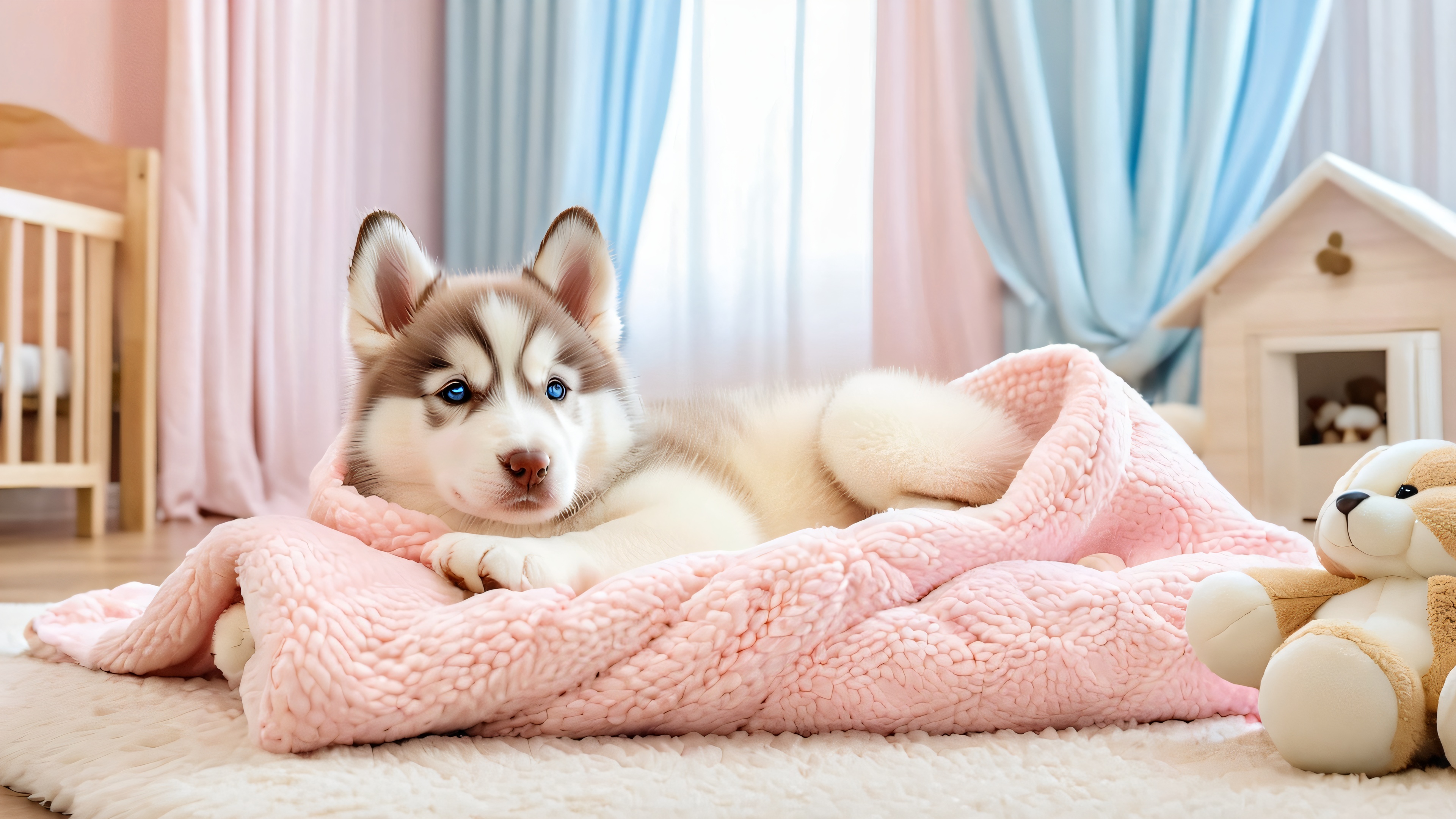 This delightful wallpaper features a sleeping baby husky puppy cozied up in a warm blanket, surrounded by plush toys and scattered dog treats. The scene is set against a snugly nursery backdrop with a plush carpet, wooden crib, and soft pastel-colored curtains. Watercolor illustrations mixed with subtle digital textures add depth and visual interest. A golden hour effect casts a warm glow on the entire scene, creating a cozy atmosphere.