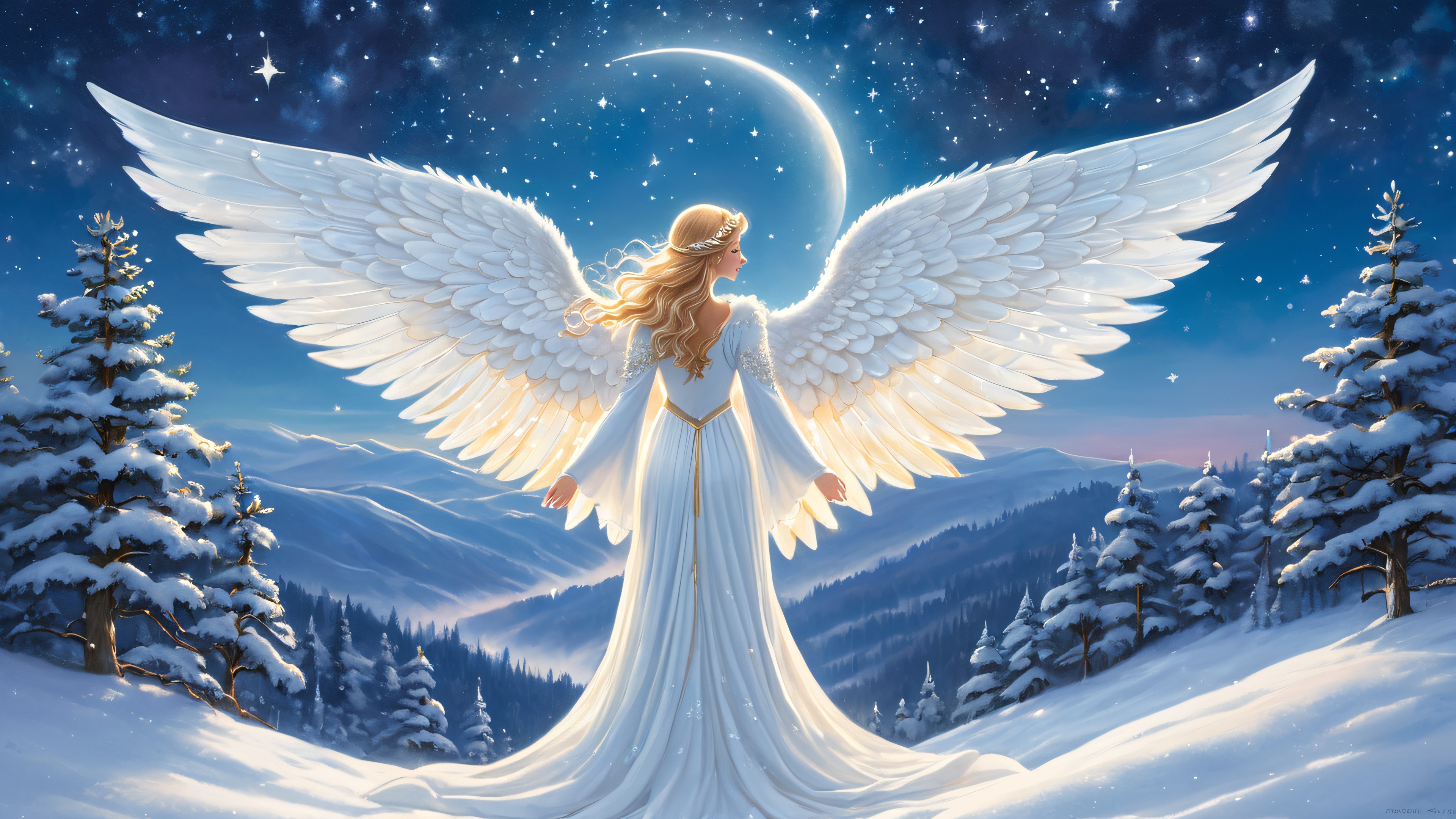 This captivating illustration transports you to a whimsical winter wonderland. The ethereal snow angel’s translucent wings spread wide, bathing her delicate features in a warm, golden light that seems almost divine. The surrounding landscape is just as breathtaking, with rolling hills, towering evergreen trees, and a blanket of freshly fallen snow that glimmers like diamonds under the soft, starry night sky.