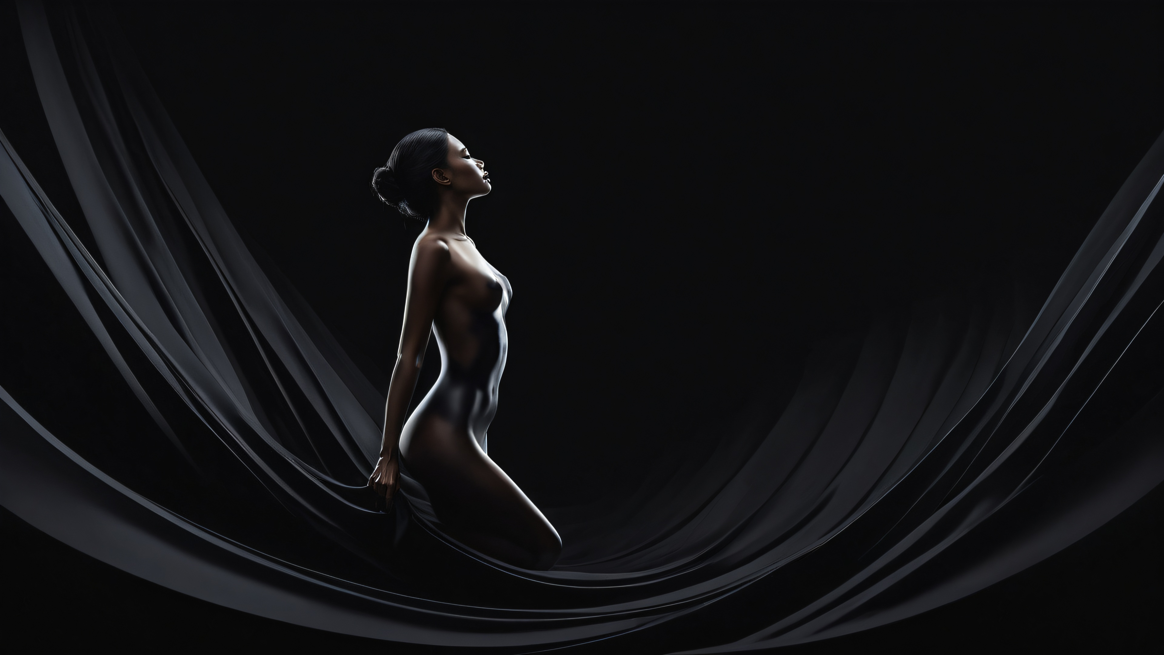This breathtaking 8k resolution wallpaper transports you to an otherworldly realm where a perfectly proportioned female figure floats serenely amidst a seemingly endless expanse of pristine darkness. The sleek, low-key lighting accentuates the subject’s elegant form, while deep perfect blacks and striking contrast create a visually stunning atmosphere that is at once mesmerizing and thought-provoking.
