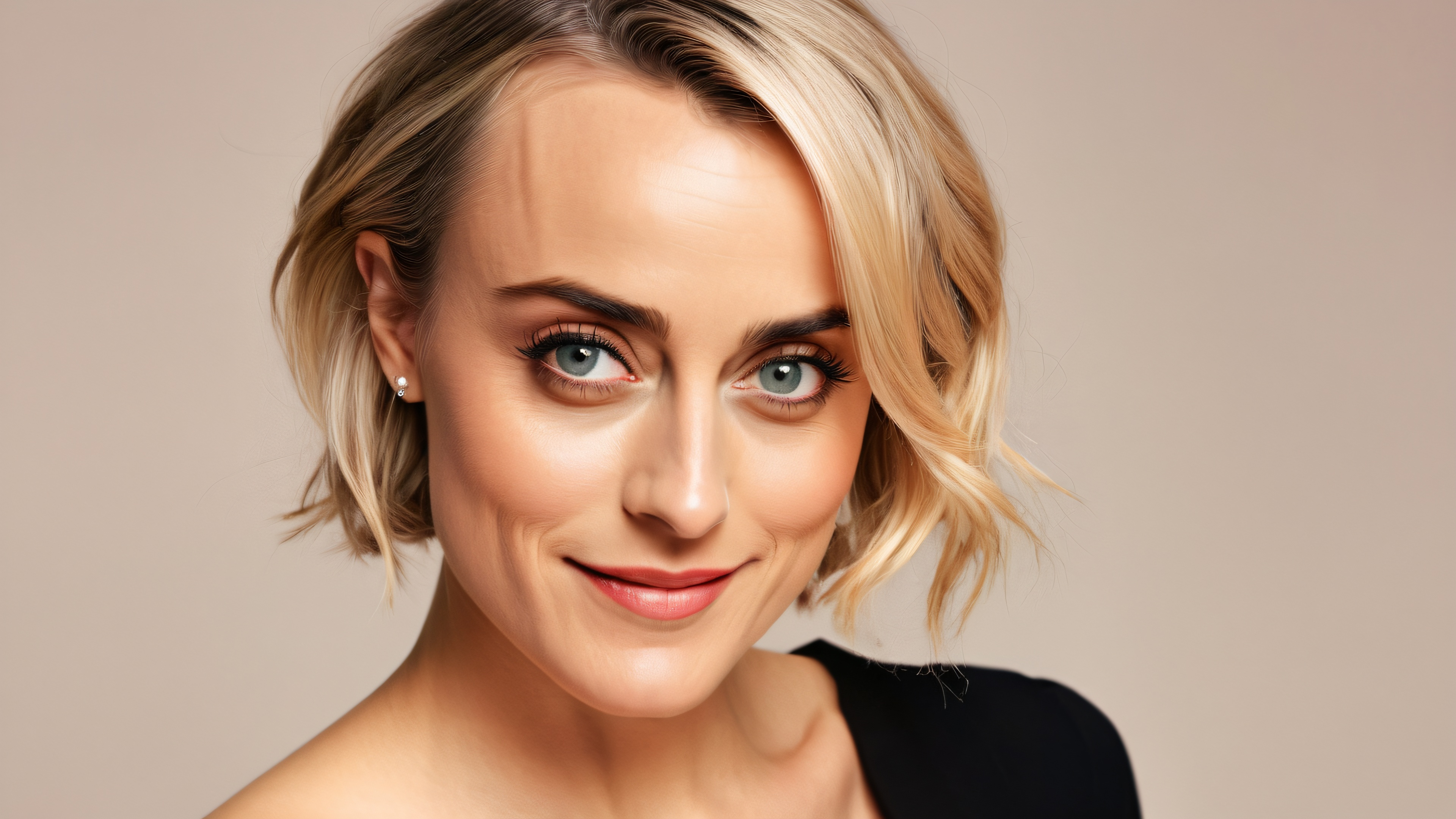 This stunning digital artwork features Taylor Schilling with a radiant and inviting smile, set against a breathtakingly clean and vast void. The subtle gradient enhances the 16:9 aspect ratio, creating an epic sense of scale. The lighting is elegant and low-key, emphasizing Taylor’s features with deep perfect blacks and striking crisp contrast. Luminescent accents add warmth and texture to the overall aesthetic.