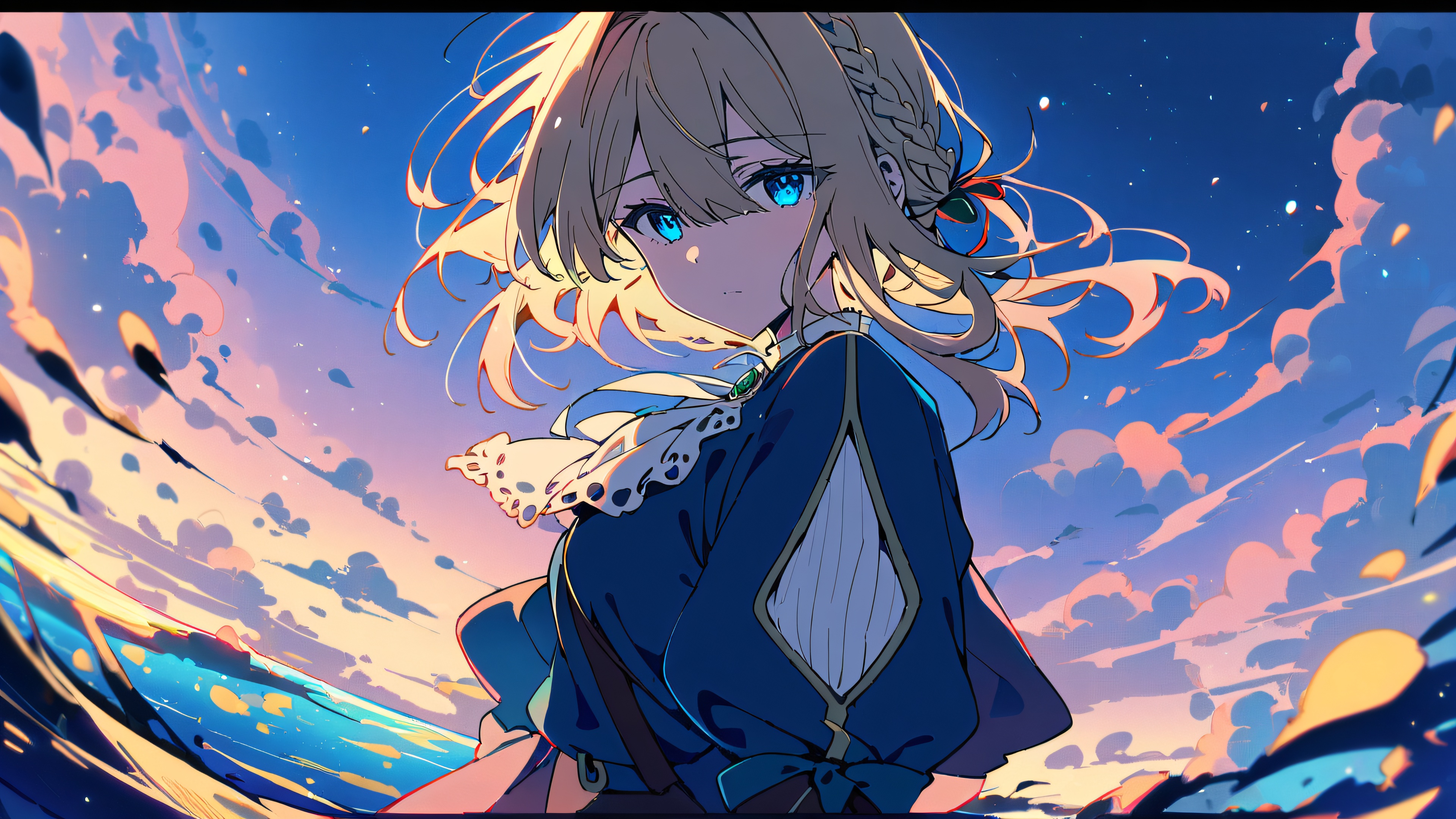 Step into the serene world of Violet Evergarden as she stands majestically against a breathtakingly clear sky. The deep blue and radiant white tones evoke a sense of ethereal wonder, drawing the viewer’s gaze to her striking presence. The cinematic lighting adds depth and dimensionality, while the vibrant colors dance across the 16:9 canvas.