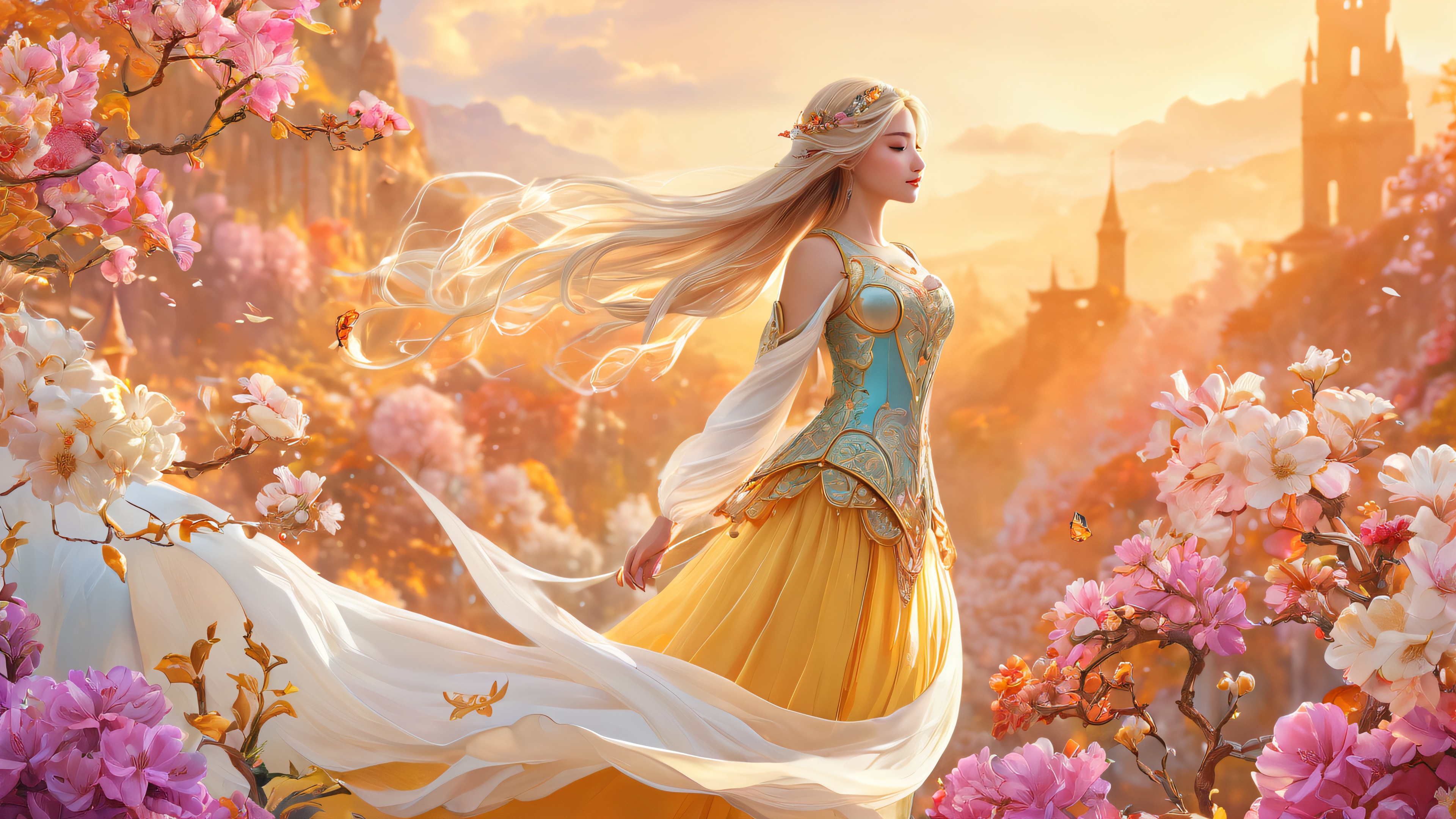 A majestic, 8K-resolution digital artwork transporting you to a realm of wonder. Soaring skies meet lush, vibrant foliage as the whimsical heroine stands tall, her blonde locks aglow with an otherworldly softness. Delicate textures and intricate details dance across the scene, radiating warmth and depth.