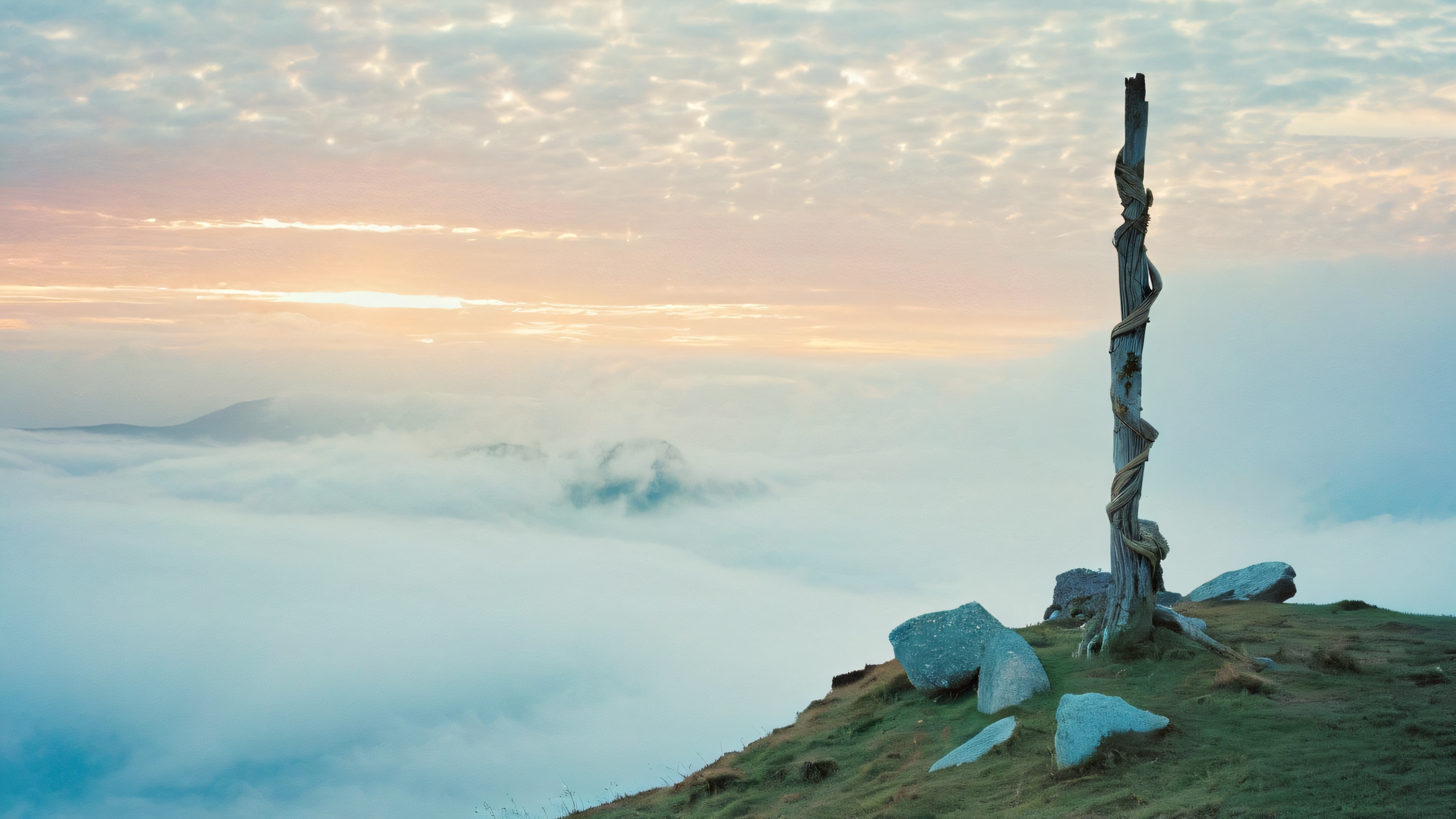 This breathtaking 16:9 masterpiece is a visual feast, showcasing a wise and enigmatic individual standing amidst a surreal landscape. The subject’s weathered cloak and staff adorned with mystical symbols seem to hum with ancient power. The surrounding environment is bathed in soft pastel hues, with shifting clouds and misty valleys evoking the threshold between worlds. Every detail is meticulously rendered, from the intricate patterns on the cloak to the subtle texture of the organic film grain.