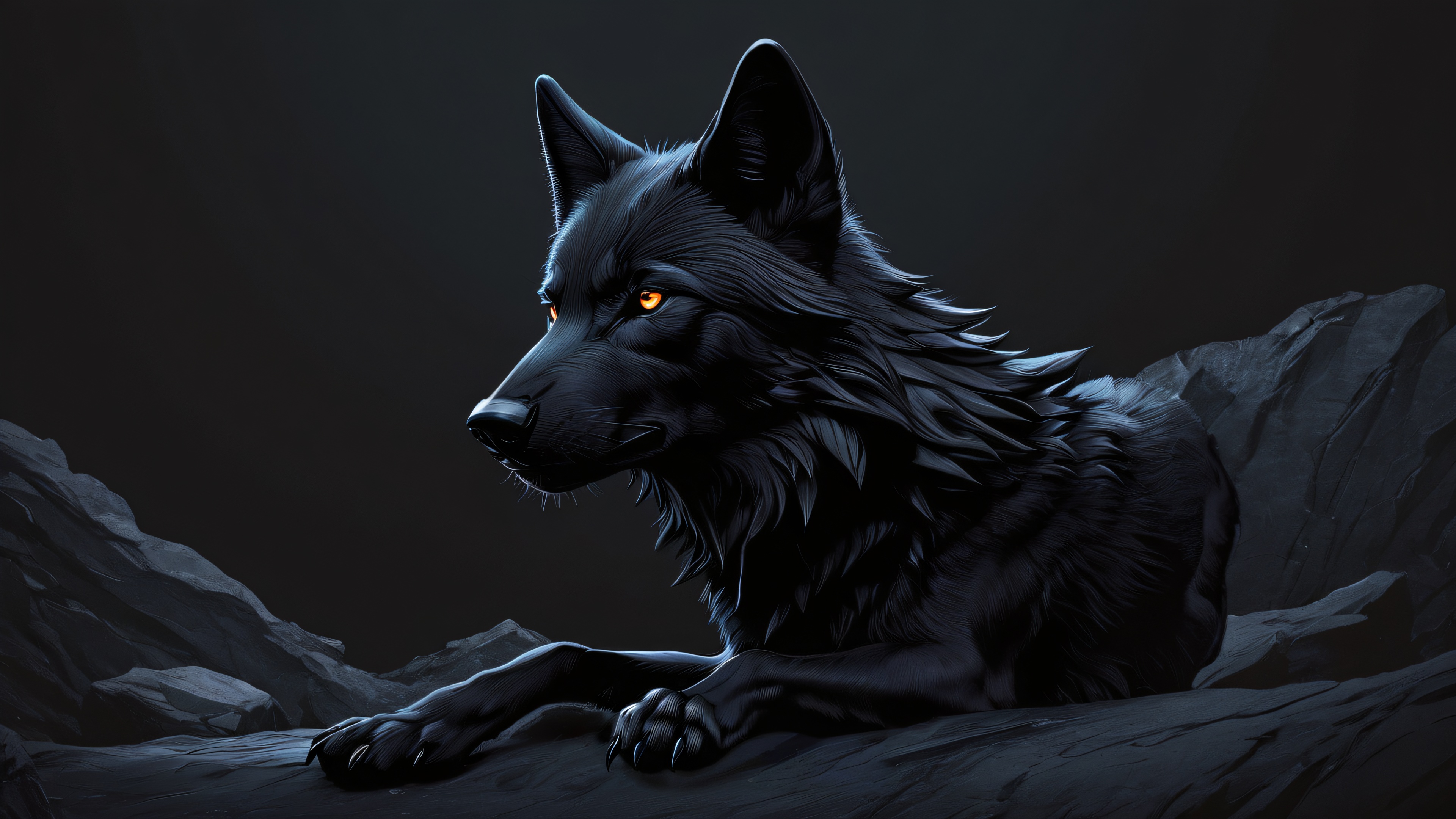 Embark on an otherworldly journey with this breathtaking digital art piece, showcasing Wolf Boy standing majestically in the heart of a vast, void-like expanse. The scene is bathed in a warm, low-key lighting that accentuates the subject’s sleek dark mode aesthetic, while deep perfect blacks and striking contrast create a visually stunning impact. Delicate luminescent accents add an air of elegance, drawing the viewer’s eye to Wolf Boy’s intricate details and textured surfaces.