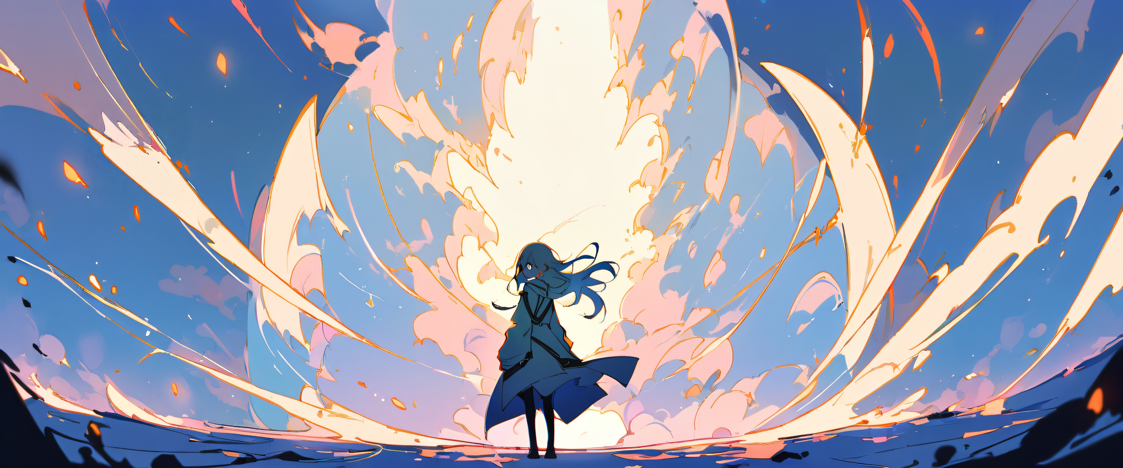 1girl, yor forger, spy x family, solo, Meisterwerk, best quality, very aesthetic, absurdres, highly detailed, looking at viewer, Perfectly clean vast pure void, extreme depth of field, Dominant blue and white palette, evoking a sense of wonder and adventure., 21:9 ultrawide panoramic aspect ratio, epic wide shot, bright and airy, ätherische Beleuchtung, beautiful sky, cinematic lighting, vivid colors