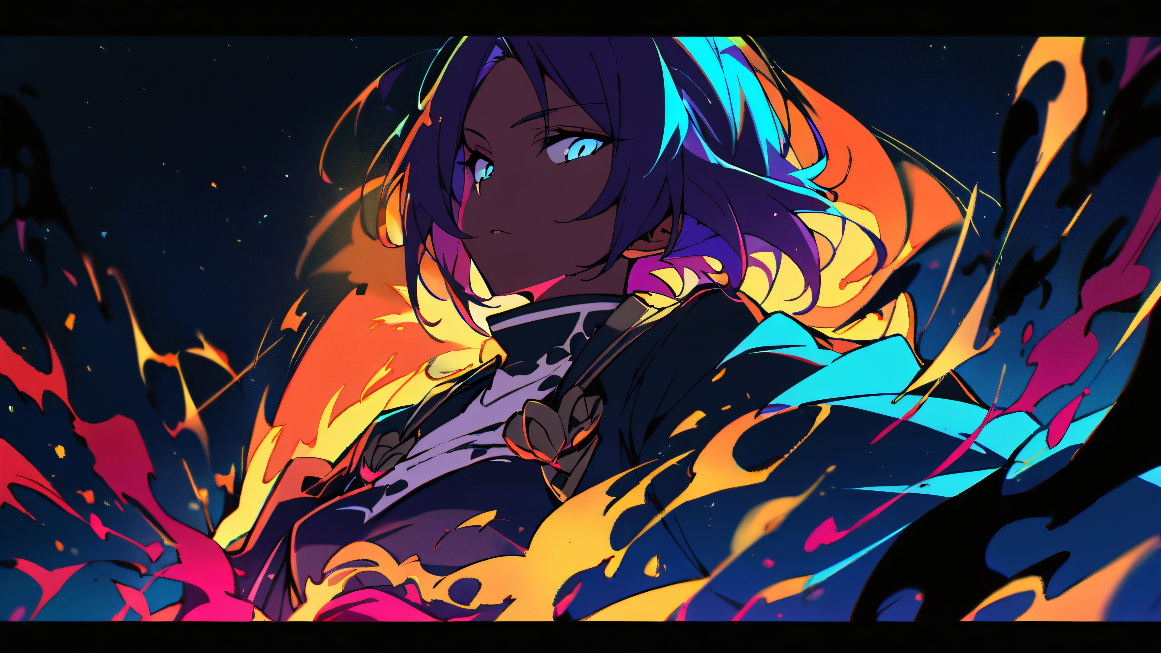1girl, yoruichi shihouin, bleach, solo, Meisterwerk, best quality, very aesthetic, absurdres, highly detailed, looking at viewer, Perfectly clean vast pure void with starred sky and extreme depth of field, [‘Golden’, ‘Crimson’, ‘Azure’], 16:9 aspect ratio, bright and airy, ätherische Beleuchtung, beautiful sky, cinematic lighting, vivid colors