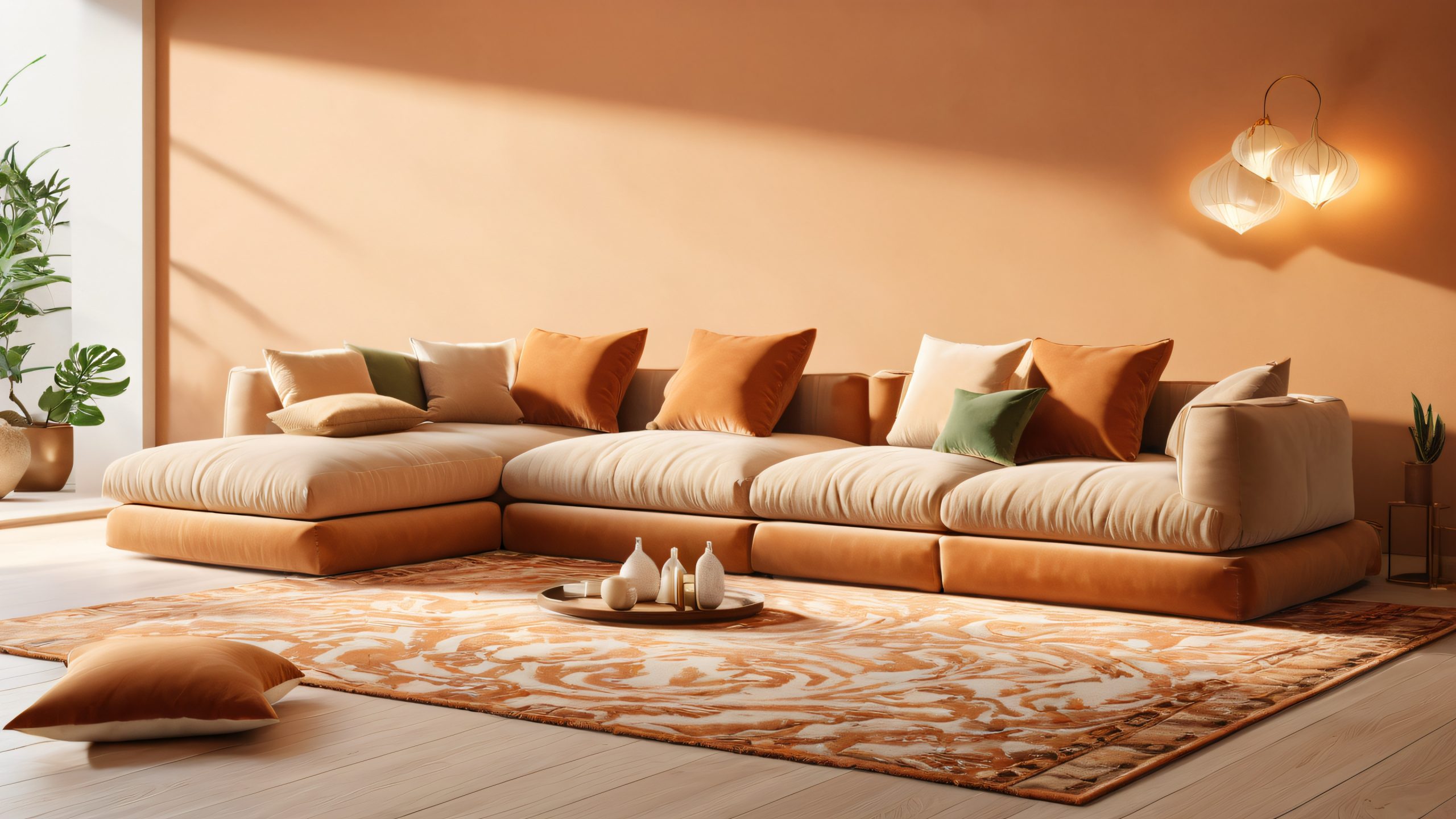 This stunning 4K wallpaper transports you to a secluded oasis, where the velvety texture of the sofa meets the intricate patterns of swirling sand dunes. The dimly lit lounge is warmed by table lamps and floor lamps, casting gentle shadows on the walls and ceiling. Rich wood accents, plush area rugs, and muted throw pillows in earthy tones complete the cozy atmosphere.
