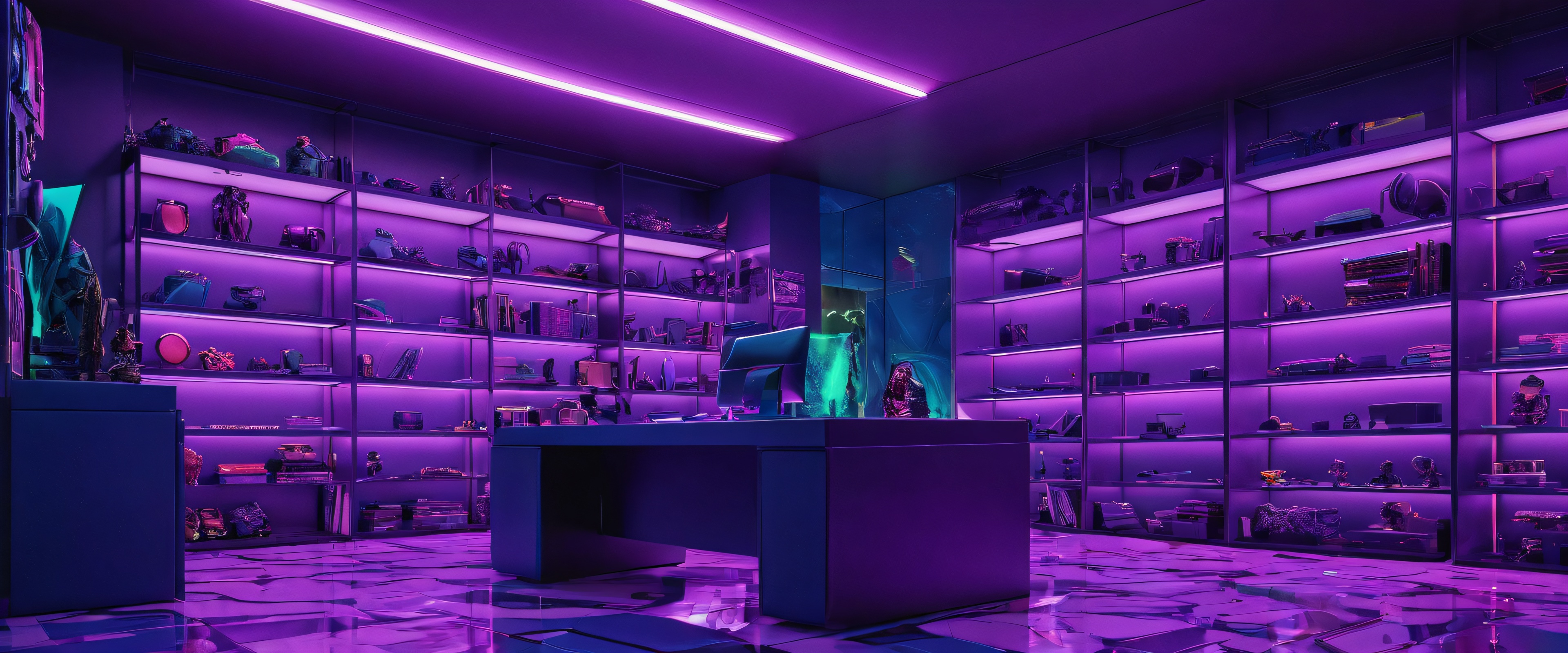 A breathtaking desktop wallpaper of Doom Slayer, indoors, shelves, perfectly clean vast pure void, extreme depth of field, award-winning digital art, pristine clarity, pixel art, Ethereal lighting: radiant, brilliant colors, ray traced reflections, and pristine clarity. Bright and airy., [‘Deep Blues’, ‘Dark Purples’], 21:9 ultrawide panoramic aspect ratio, epic wide shot, ethereal lighting, radiant, brilliant colors, ray traced reflections, pristine clarity, award-winning digital art, epic breathtaking scale, stunning visual impact, perfect composition, highly textured surfaces, intricate micro-details, physically based rendering, macOS wallpaper aesthetic, masterpiece, highest quality, highly detailed, 8k resolution.