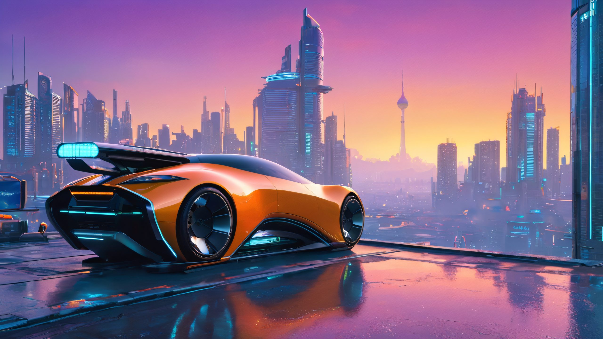 This breathtaking 4K wallpaper features a gritty, industrial cityscape at the intersection of technology and humanity. The scene is set against a warm, orange-hued twilight, with the city’s neon lights casting a gaudy glow. The palette is dominated by deep blues and purples, accented with neon pinks, greens, and yellows, and hints of metallic grays and warm golden tones.