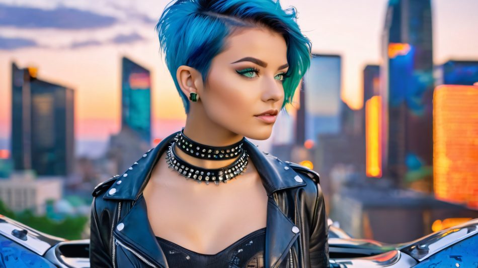 A stunning cityscape at sunset, with towering skyscrapers, neon lights reflecting off wet pavement, and a haze of smoke and pollution hanging in the air. The young woman, with electric blue hair and striking green eyes, stands confidently in front of the city, surrounded by a gritty, urban landscape.