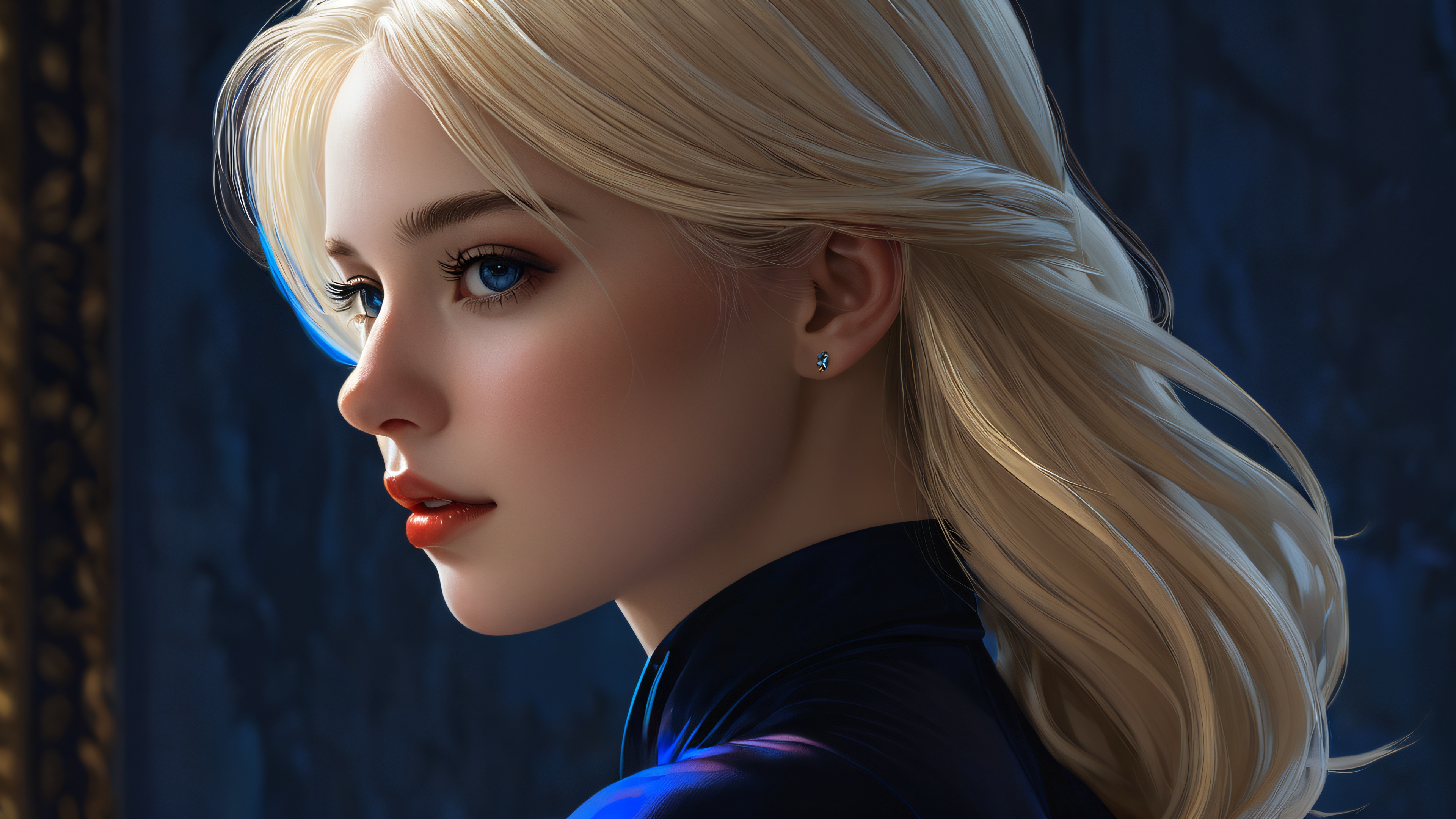 This breathtaking desktop wallpaper features an award-winning digital artwork of a beautiful blonde girl set against a pristine and clean vast pure void. The scene is characterized by sleek dark mode aesthetic with deep perfect blacks, striking crisp contrast, and elegant luminescent accents in shades of blue. The 16:9 aspect ratio and elegant low-key lighting add to the masterpiece’s visual impact.