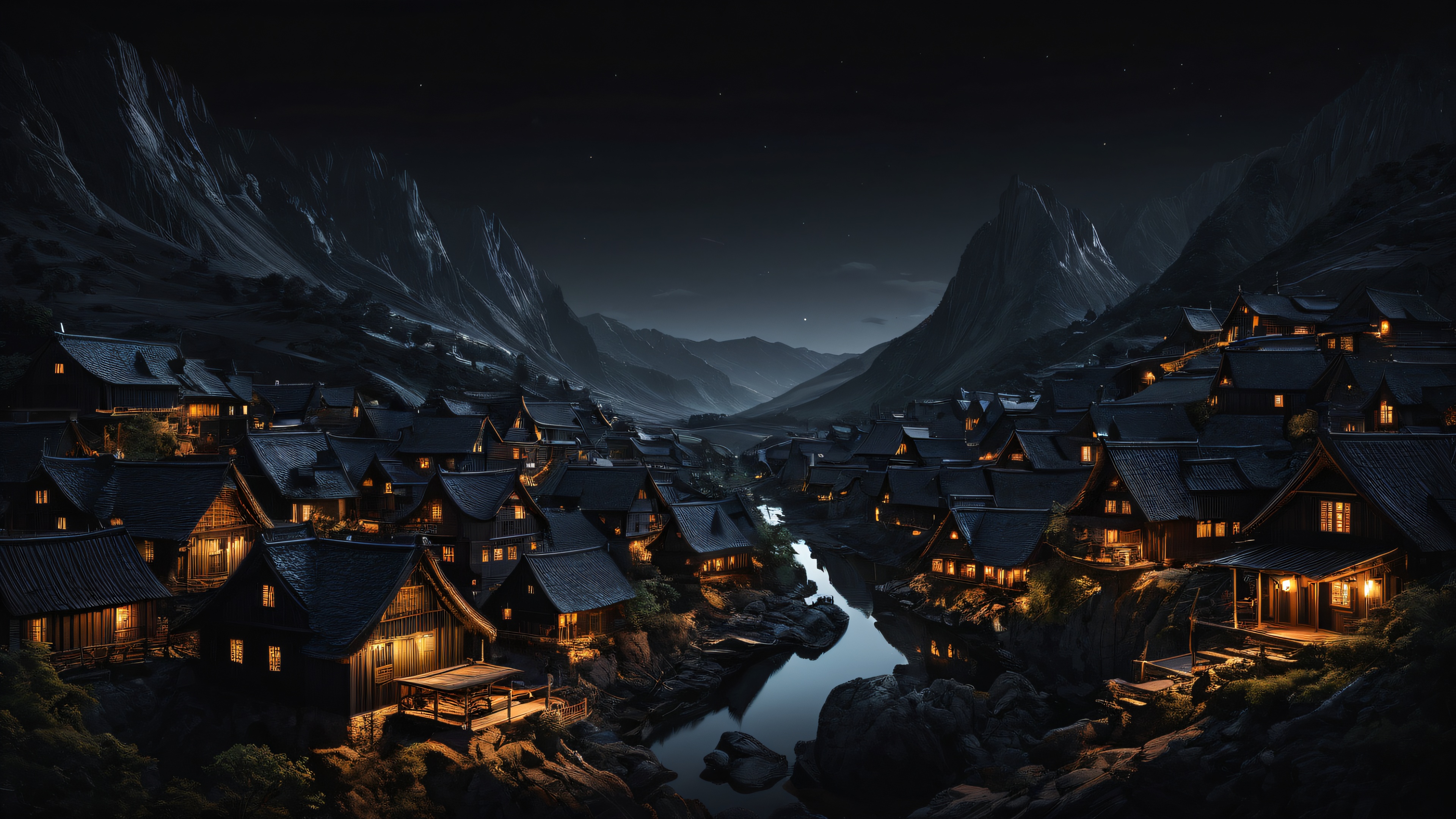 Step into a world of tranquility with this exquisite digital art piece. A pristine village landscape unfolds against a backdrop of deep, velvety blacks, punctuated by warm, luminescent accents that seem to glow from within. The intricate textures and micro-details are so lifelike, you’ll feel like you’re standing there, basking in the serene atmosphere.