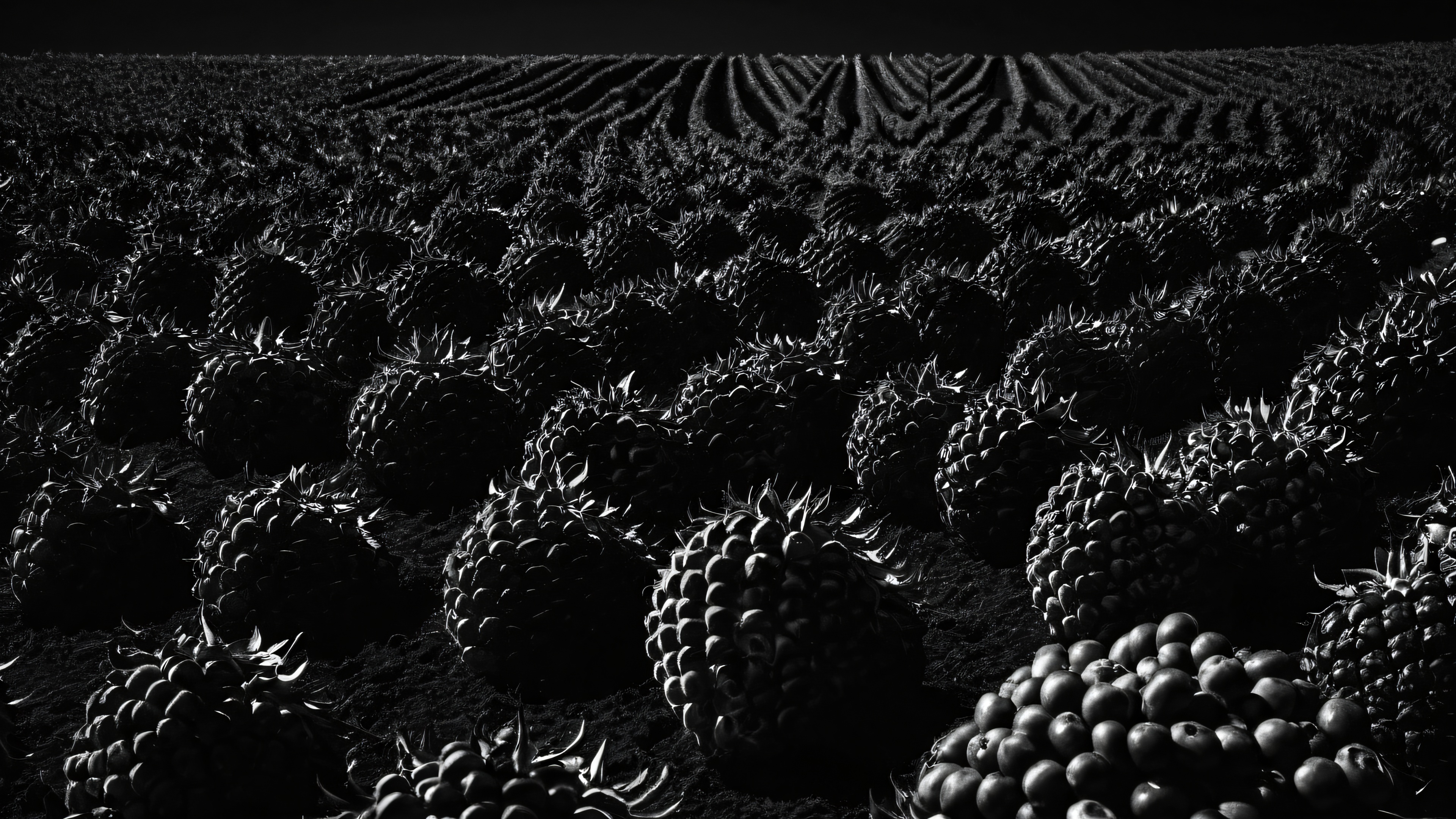 Immerse yourself in this stunning digital art masterpiece, featuring an award-winning depiction of a fruit farm in sleek dark mode aesthetic. Enjoy the perfect blend of elegant luminescent accents, deep rich colors, and striking contrast against a backdrop of pristine blacks. The 8K resolution ensures an unparalleled level of detail, from the intricate micro-details to the highly textured surfaces.