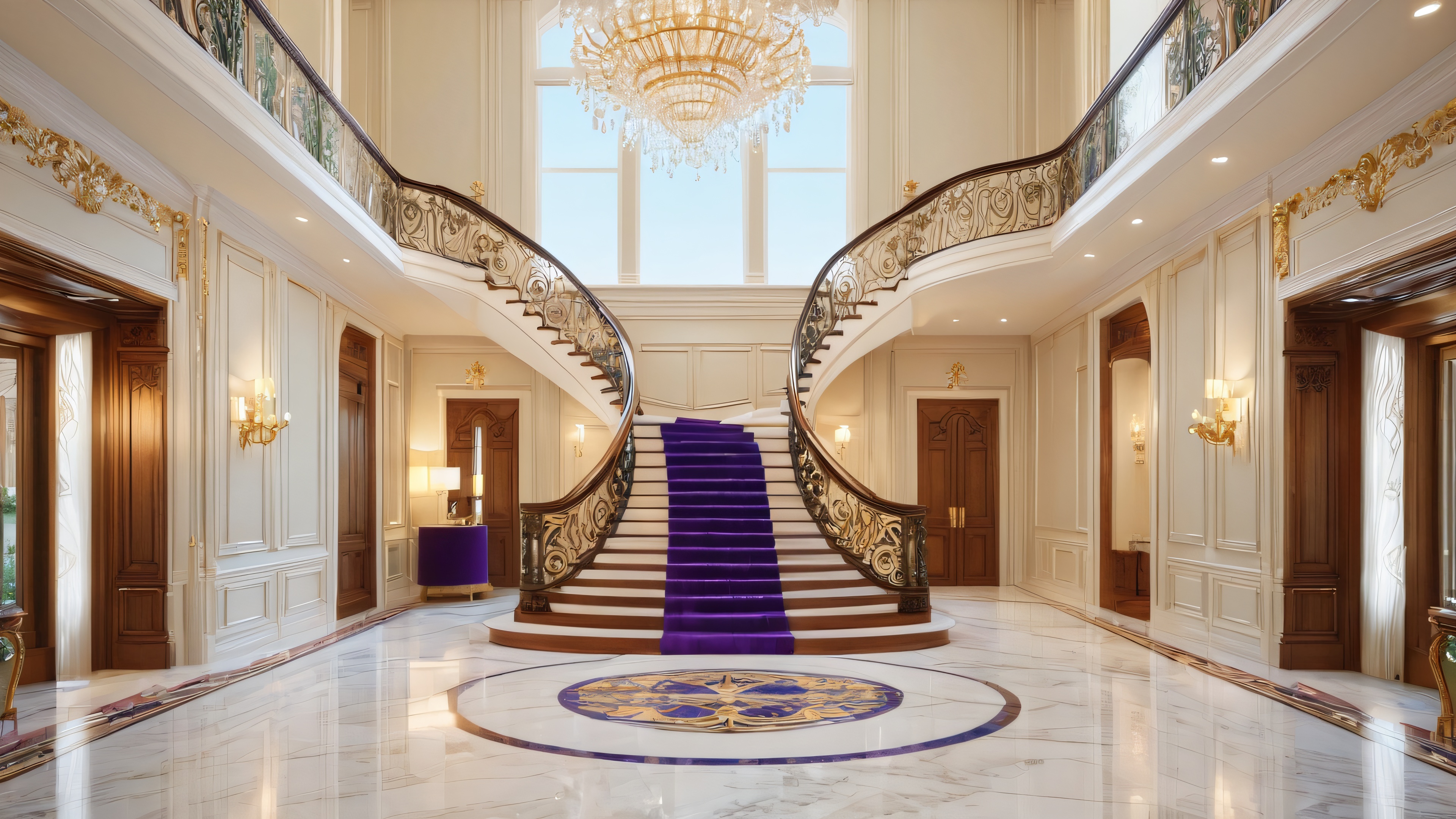 A grand, ornate staircase leads down to a refined foyer, complete with an impressive wooden door and stunning crystal chandelier. The atmosphere is sophisticated and inviting, filled with hints of opulence and grandeur. Soft, warm golden light pours in through large windows, accentuating the intricate details and textures.
