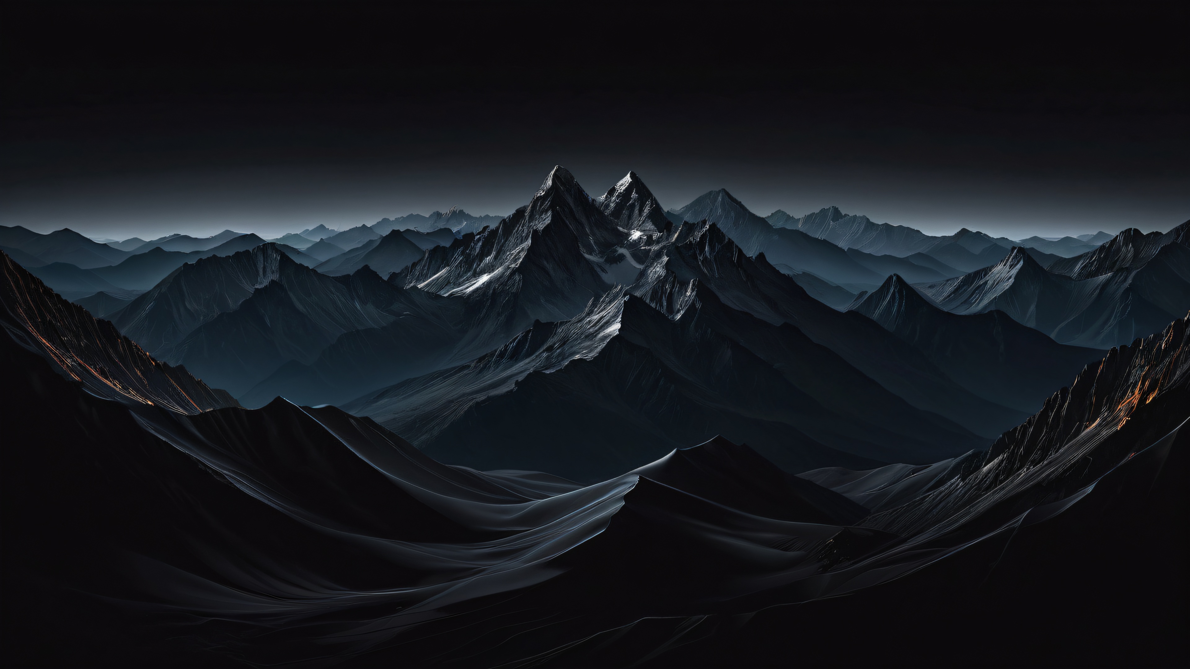 This stunning wallpaper features majestic mountains that seem to stretch into infinity, set against a brilliant blue sky. The scene is characterized by deep perfect blacks, striking crisp contrast, and elegant luminescent accents. The resulting visual impact is breathtakingly epic in scale, with intricate micro-details and highly textured surfaces.