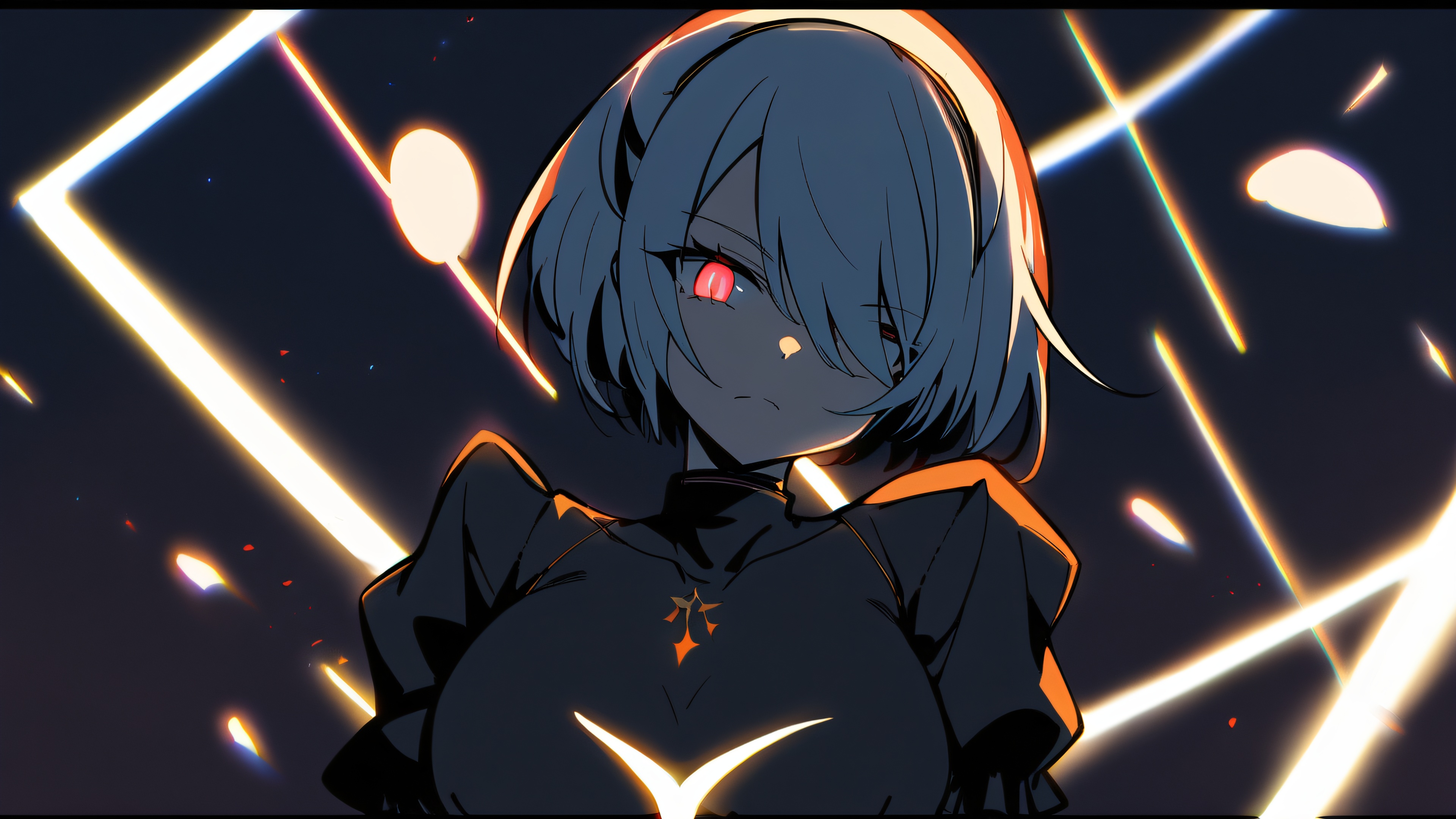 This breathtaking anime-inspired wallpaper features an elegant oni girl standing majestically against the backdrop of a seemingly endless, pitch-black expanse. The void is punctuated only by subtle, glowing lights that seem to emanate from within, casting dramatic shadows across her striking features. Her piercing gaze appears to pierce through the darkness, drawing your attention and holding it captive.