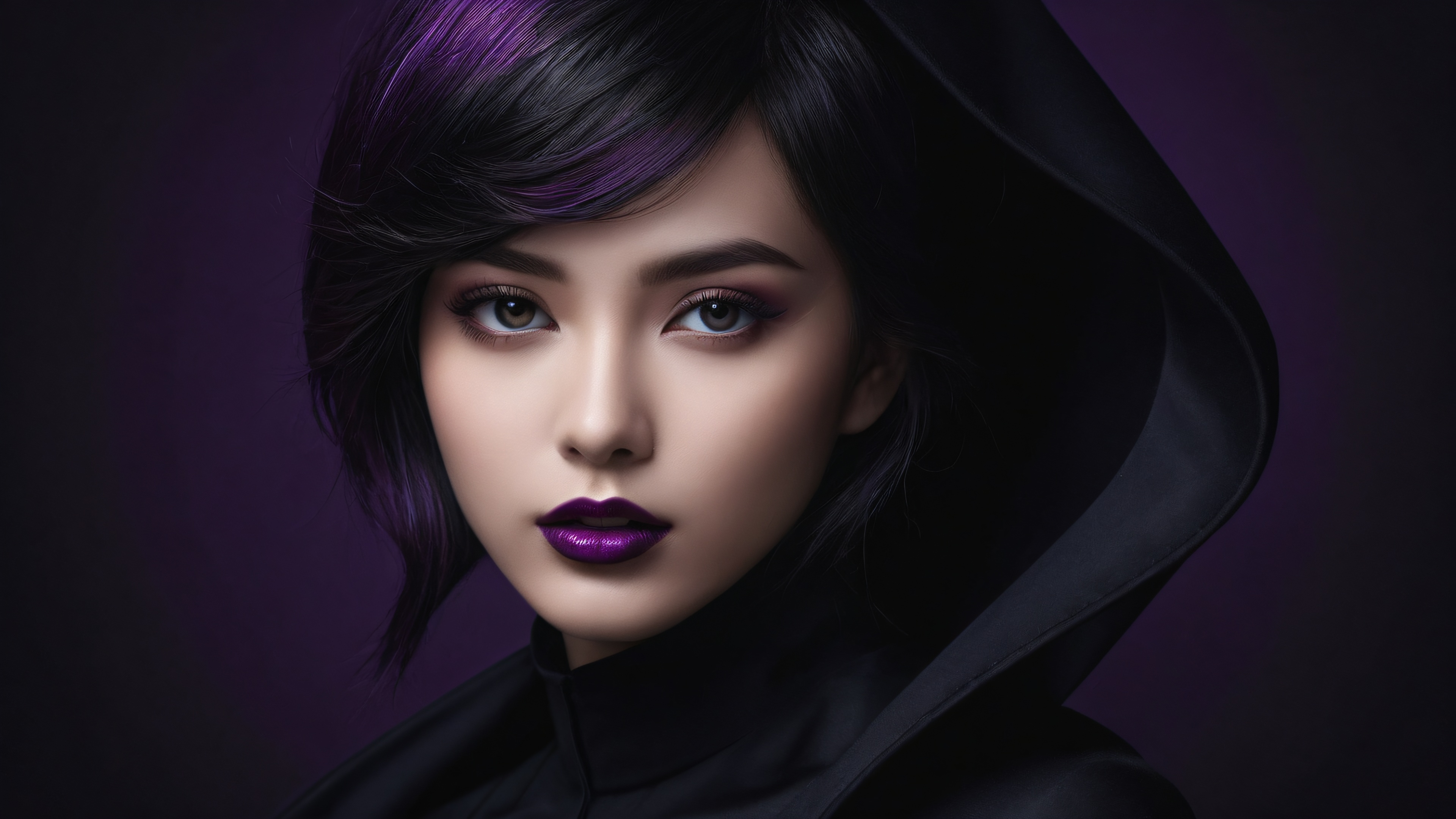 A breathtaking desktop wallpaper of Girl, Perfectly clean vast pure void, extreme depth of field, Award-winning digital art, pristine clarity, SLEEK DARK MODE AESTHETIC. Deep perfect blacks, striking crisp contrast, and elegant luminescent accents, [‘Crisp Whites’, ‘Deep Purples’], 16:9 aspect ratio, elegant low-key lighting, deep perfect blacks, striking contrast, sleek dark mode aesthetic, luminescent accents, deep rich colors, award-winning digital art, epic breathtaking scale, stunning visual impact, perfect composition, highly textured surfaces, intricate micro-details, physically based rendering, macOS wallpaper aesthetic, masterpiece, highest quality, highly detailed, 8k resolution.