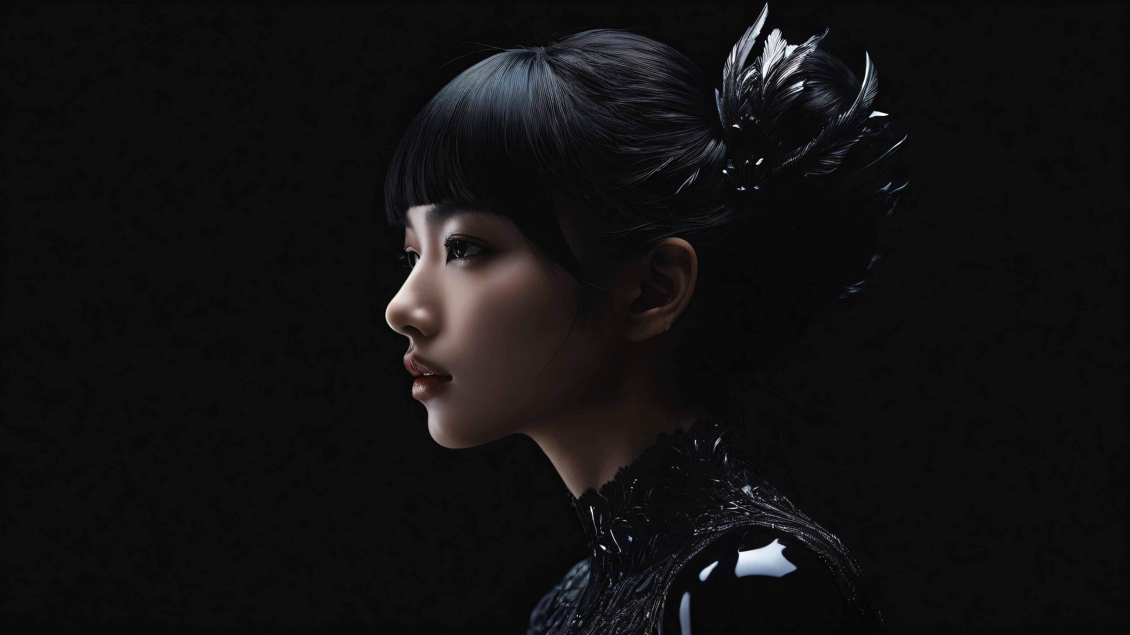 A breathtaking desktop wallpaper of Girl, perfectly clean vast pure void, extreme depth of field, award-winning digital art, pristine clarity, SLEEK DARK MODE AESTHETIC. Deep perfect blacks, striking crisp contrast, and elegant luminescent accents., [‘#8B9467’, ‘#333’], 16:9 aspect ratio, elegant low-key lighting, deep perfect blacks, striking contrast, sleek dark mode aesthetic, luminescent accents, deep rich colors, award-winning digital art, epic breathtaking scale, stunning visual impact, perfect composition, highly textured surfaces, intricate micro-details, physically based rendering, macOS wallpaper aesthetic, masterpiece, highest quality, highly detailed, 8k resolution.