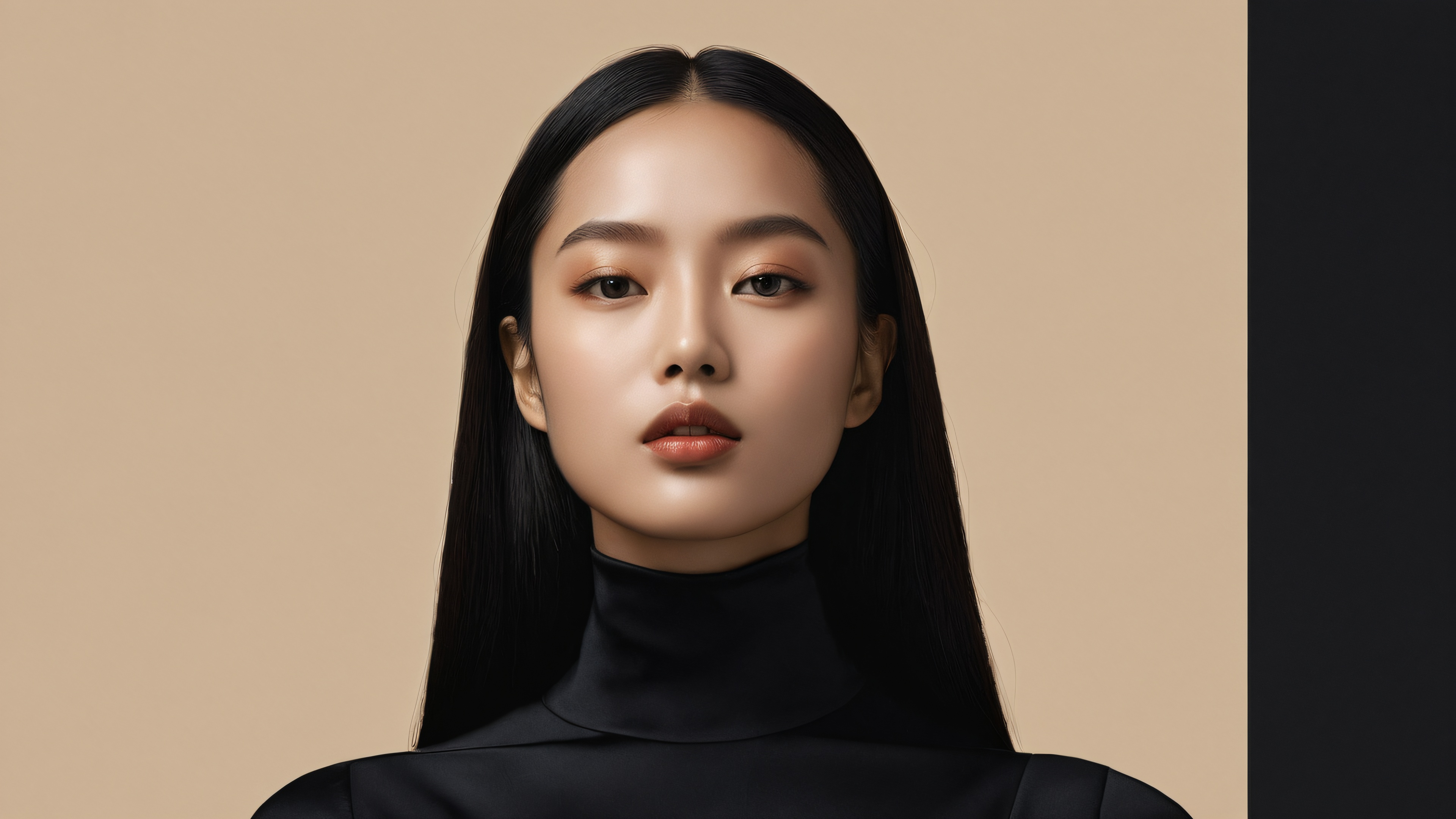 A breathtaking desktop wallpaper of Portrait, Perfectly clean vast pure void, extreme depth of field, Award-winning digital art, pristine clarity, SLEEK DARK MODE AESTHETIC. Deep perfect blacks, striking crisp contrast, and elegant luminescent accents., [‘Cream’, ‘Warm Beige’], 16:9 aspect ratio, elegant low-key lighting, deep perfect blacks, striking contrast, sleek dark mode aesthetic, luminescent accents, deep rich colors, award-winning digital art, epic breathtaking scale, stunning visual impact, perfect composition, highly textured surfaces, intricate micro-details, physically based rendering, macOS wallpaper aesthetic, masterpiece, highest quality, highly detailed, 8k resolution.
