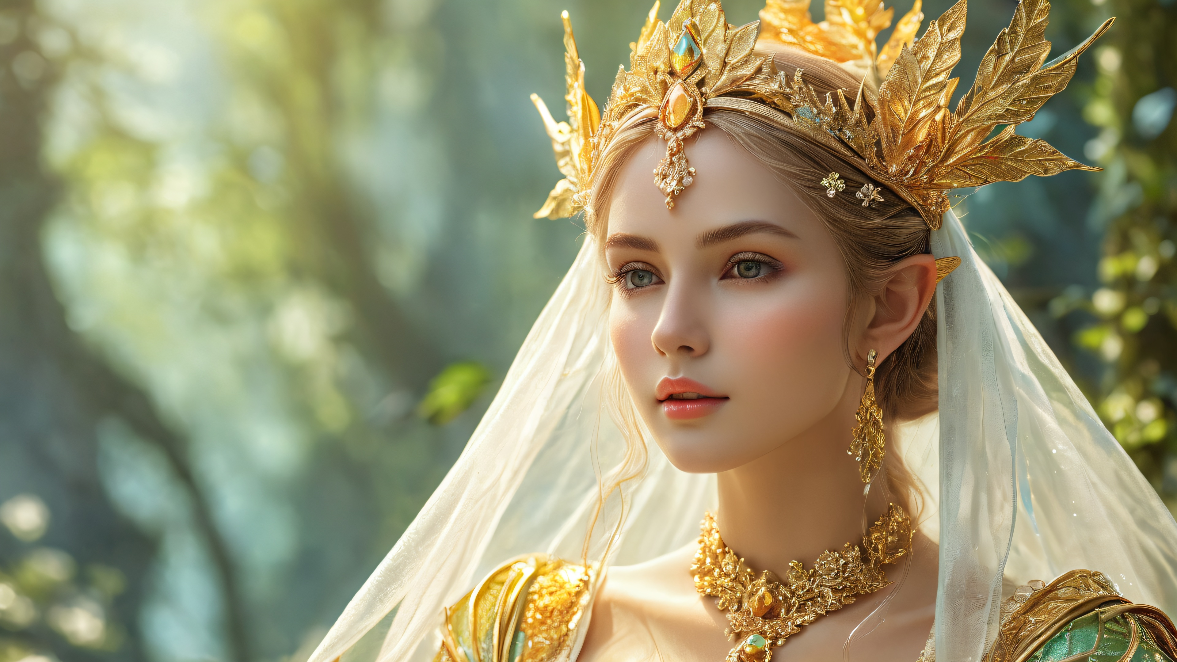 A breathtaking desktop wallpaper of Elf Maiden, Perfectly clean vast pure void, extreme depth of field, ethereal mist., Award-winning digital art, pristine clarity, intricate details, and realistic textures., Ethereal lighting with radiant, brilliant colors, ray traced reflections, and pristine clarity. Bright and airy., [‘Golden’, ‘Creamy’], 16:9 aspect ratio, ethereal lighting, radiant, brilliant colors, ray traced reflections, pristine clarity, award-winning digital art, epic breathtaking scale, stunning visual impact, perfect composition, highly textured surfaces, intricate micro-details, physically based rendering, macOS wallpaper aesthetic, masterpiece, highest quality, highly detailed, 8k resolution.