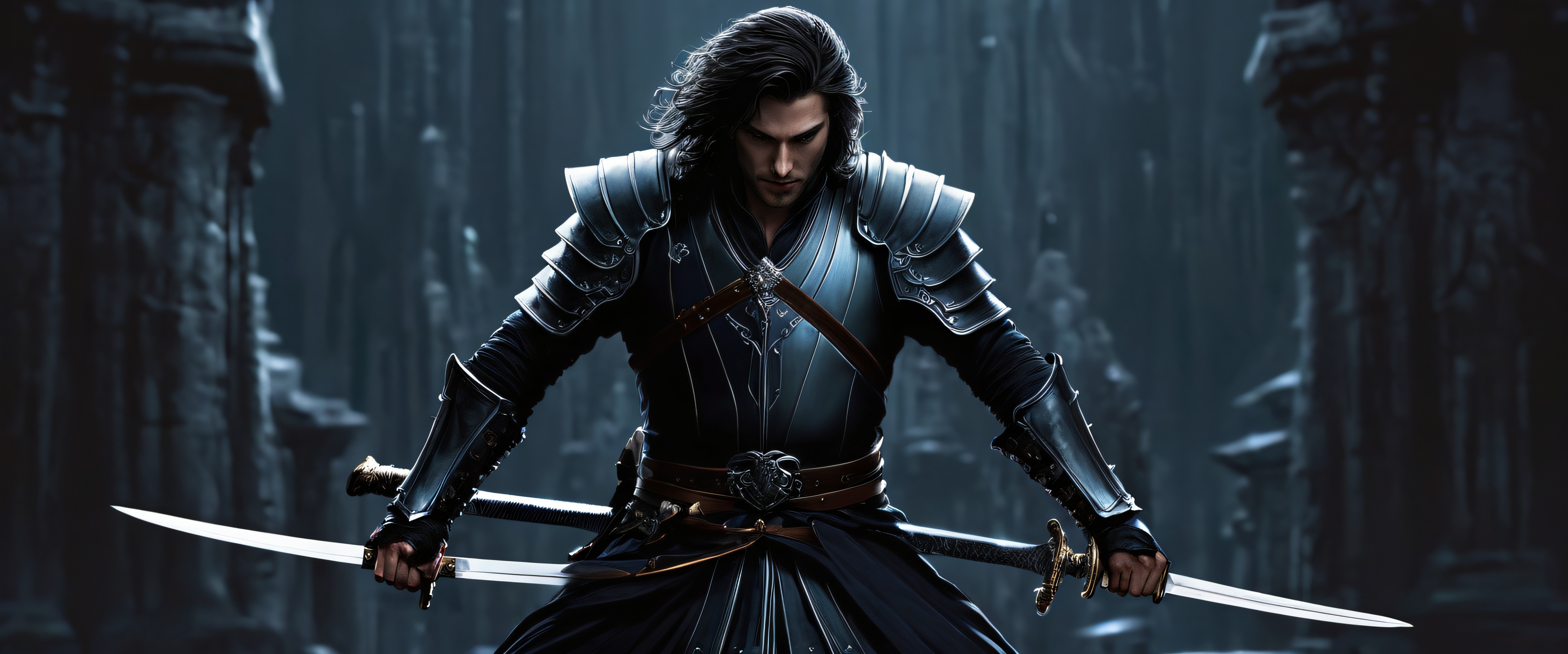A sweeping, award-winning digital art masterpiece that transports your desktop to an otherworldly realm. The sleek, dark mode aesthetic features perfectly clean, vast pure voids, punctuated by the elegant low-key lighting of men wielding swords. Dominant blues and silvers swirl across the panoramic aspect ratio, creating a breathtaking scale with stunning visual impact. Highly textured surfaces and intricate micro-details add to the physicality of the scene, making it feel almost tangible.
