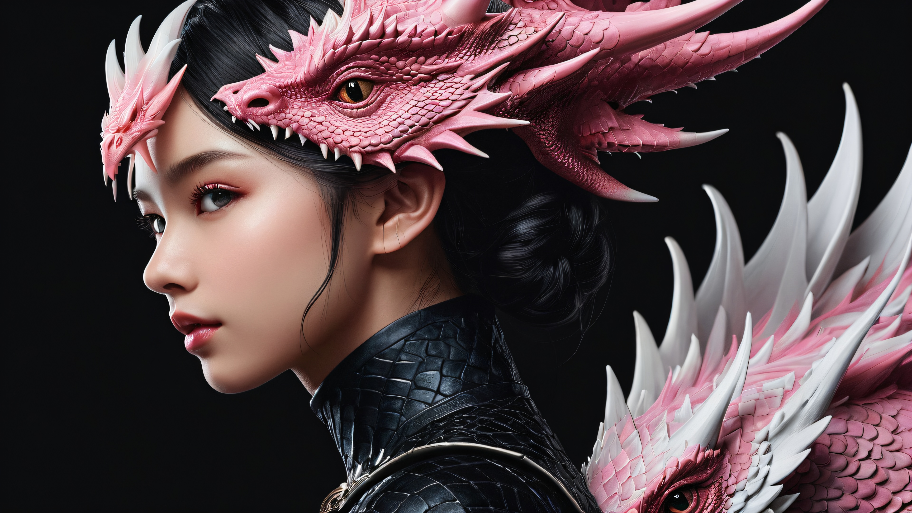 A breathtaking desktop wallpaper of Dragon Girl, Perfectly clean vast pure void, extreme depth of field, subtle texture adding depth, Award-winning digital art, pristine clarity, fantasy-inspired illustrations with intricate details, Sleek Dark Mode Aesthetic: Deep perfect blacks, striking crisp contrast, and elegant luminescent accents, {‘dominant’: ‘#FF69B4’, ‘palette’: [‘Pink’, ‘White’]}, 16:9 aspect ratio, elegant low-key lighting, deep perfect blacks, striking contrast, sleek dark mode aesthetic, luminescent accents, deep rich colors, award-winning digital art, epic breathtaking scale, stunning visual impact, perfect composition, highly textured surfaces, intricate micro-details, physically based rendering, macOS wallpaper aesthetic, masterpiece, highest quality, highly detailed, 8k resolution.
