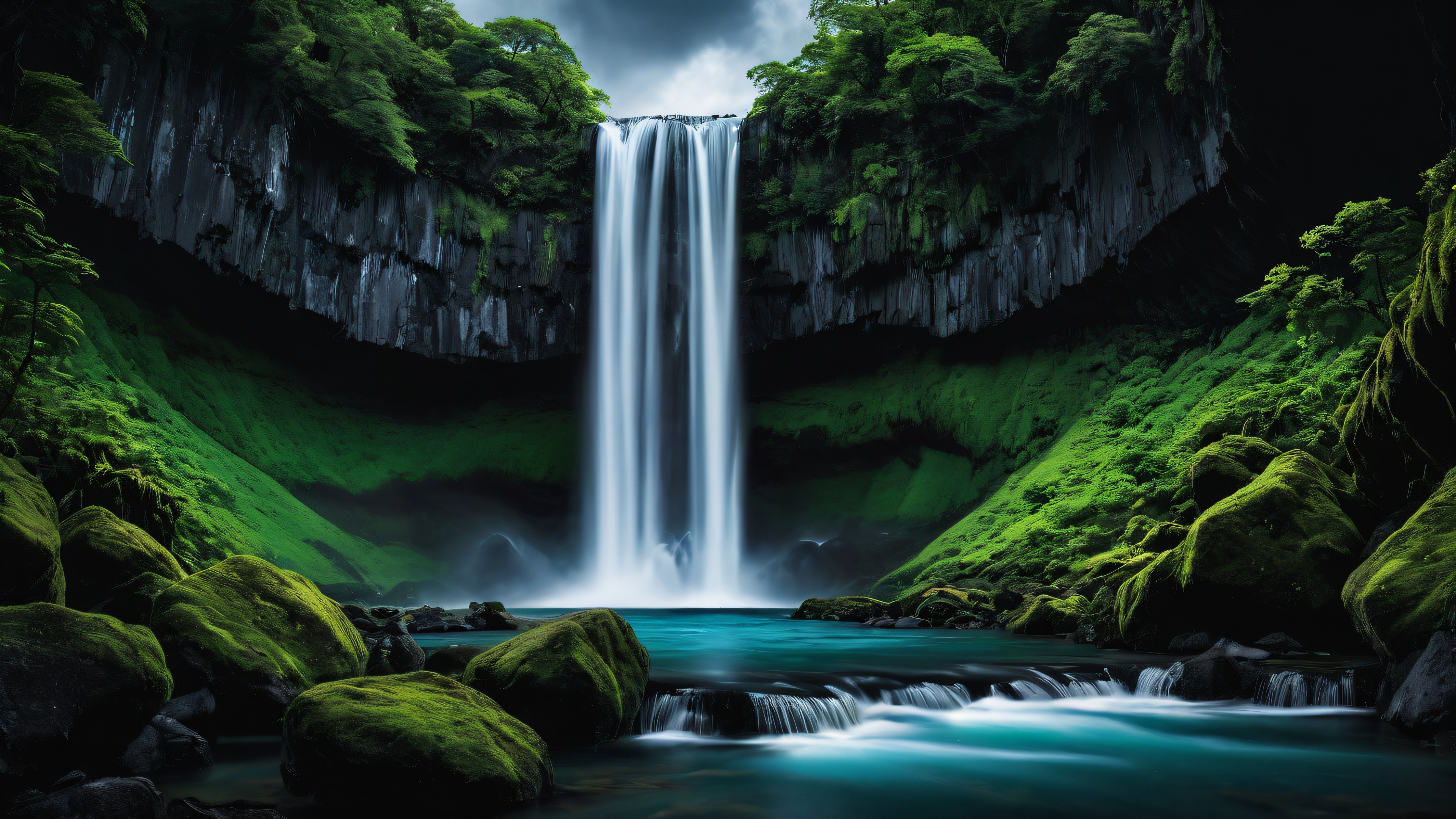 A breathtaking desktop wallpaper of Waterfall, perfectly clean vast pure void, extreme depth of field, water, waterfall, clouds, award-winning digital art, pristine clarity, digital painting, illustration, SLEEK DARK MODE AESTHETIC. Deep perfect blacks, striking crisp contrast, and elegant luminescent accents, [‘Blue’, ‘Green’, ‘Waterfall Blue’], 16:9 aspect ratio, elegant low-key lighting, deep perfect blacks, striking contrast, sleek dark mode aesthetic, luminescent accents, deep rich colors, award-winning digital art, epic breathtaking scale, stunning visual impact, perfect composition, highly textured surfaces, intricate micro-details, physically based rendering, macOS wallpaper aesthetic, masterpiece, highest quality, highly detailed, 8k resolution.