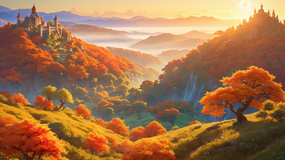This hand-painted, whimsical desktop wallpaper transports you to a mystical realm where ancient forests meet sprawling mountains. Soft, golden hour lighting casts long shadows across the terrain, as the stars begin to twinkle in the night sky. The warm palette features earthy tones, with flashes of fiery orange and crimson, evoking a sense of wonder and discovery.